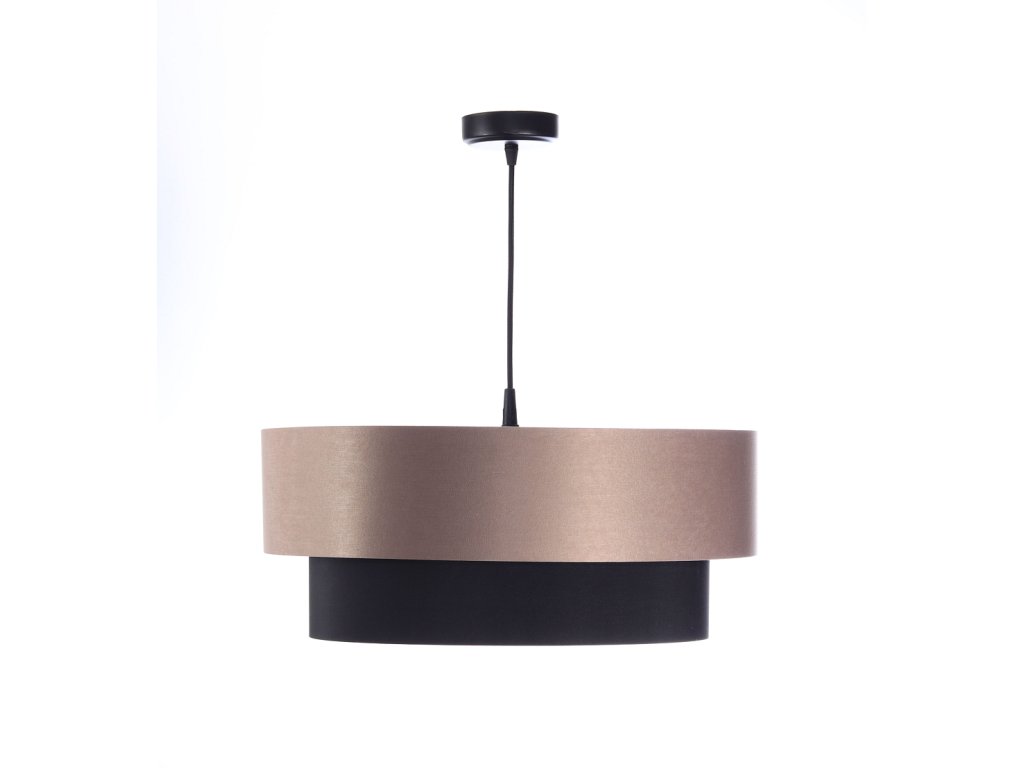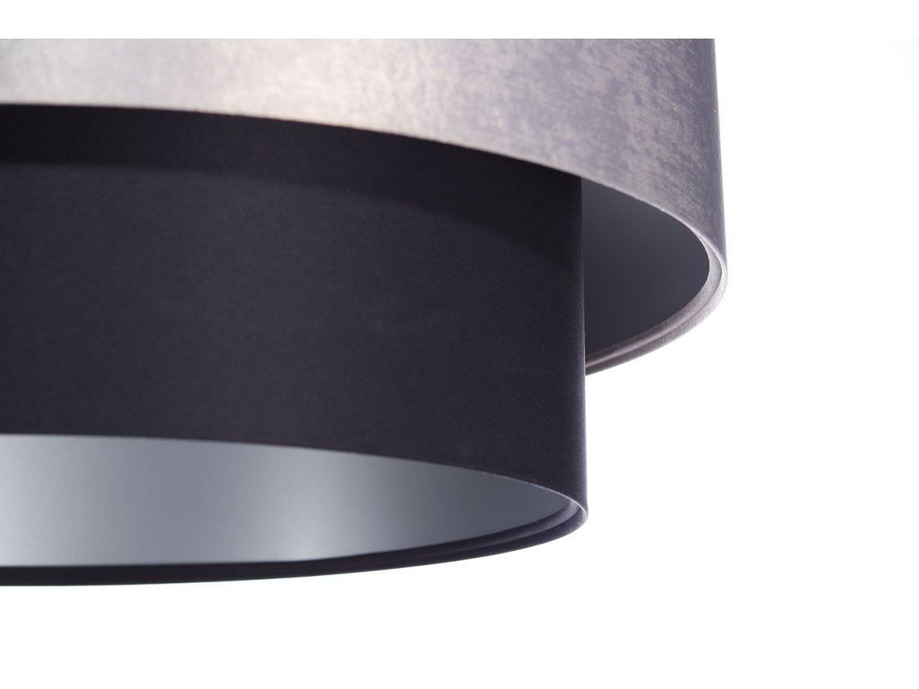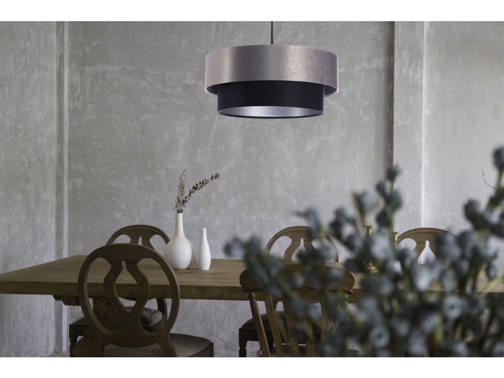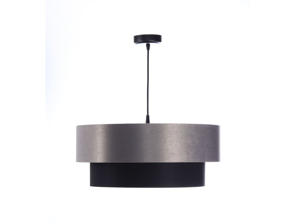 Závesné svietidlo DUO v čiernej farbe v kombinácii s tromi farebnými variantmi - šedá, béžová a krémová. Tienidlo je odolné voči UV žiareniu, takže tkanina počas používania nevybledne. Priemer svietidla je 60 cm. Skvele sa hodí do obývacej izby či spálne.