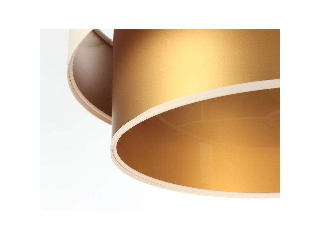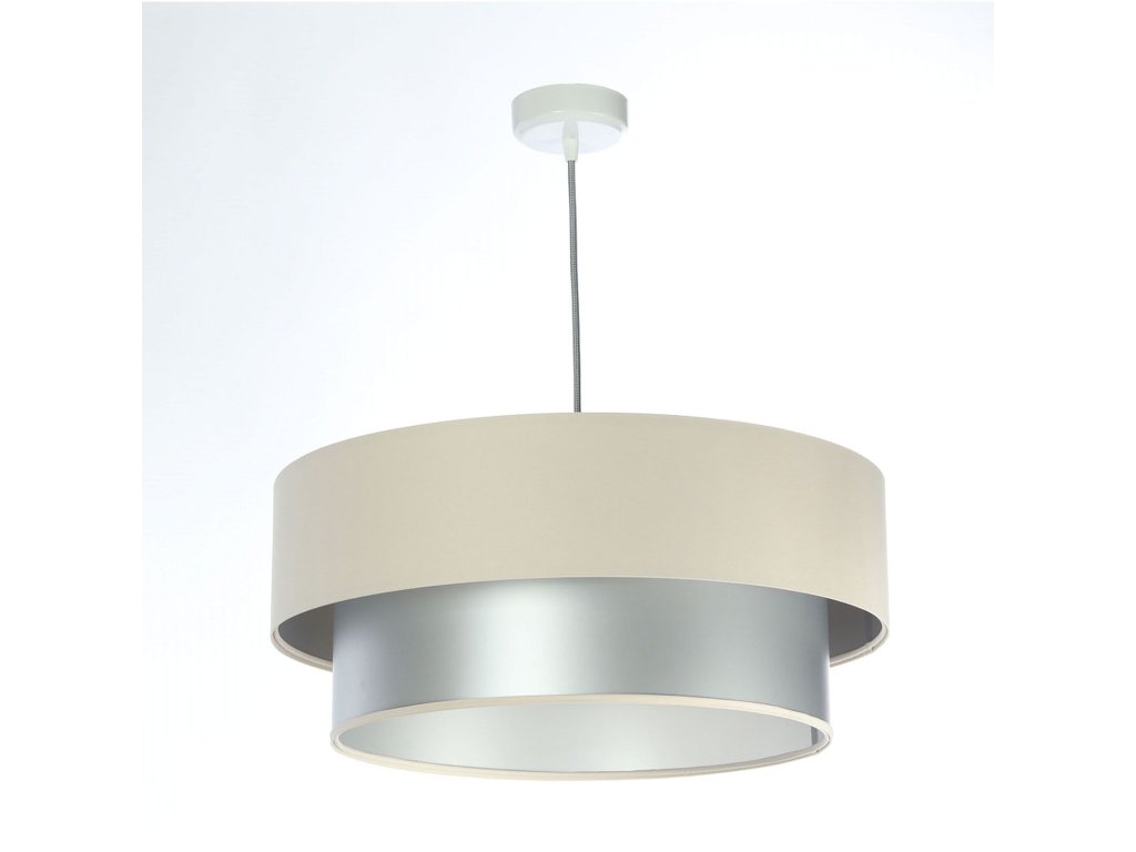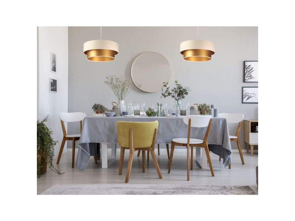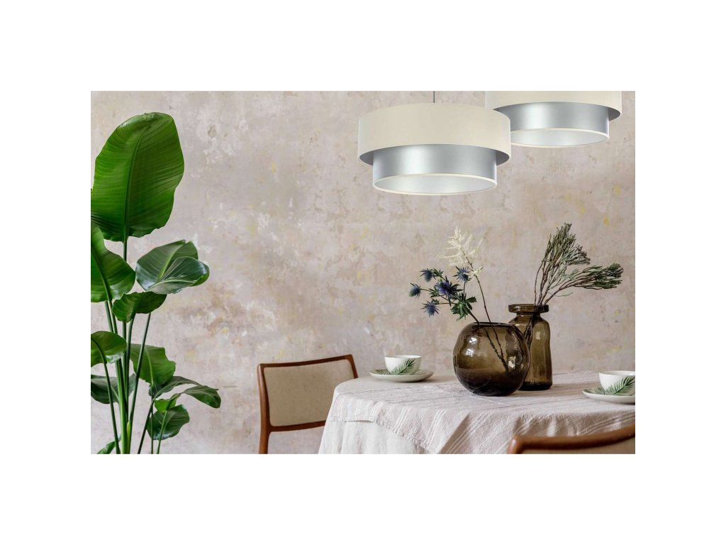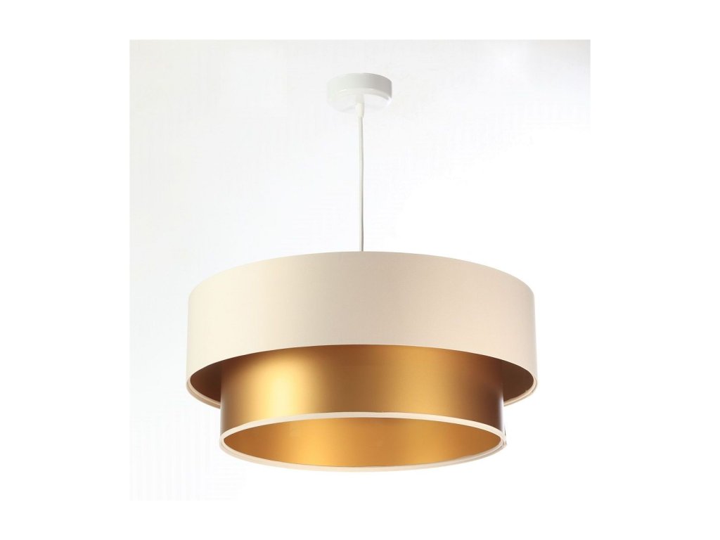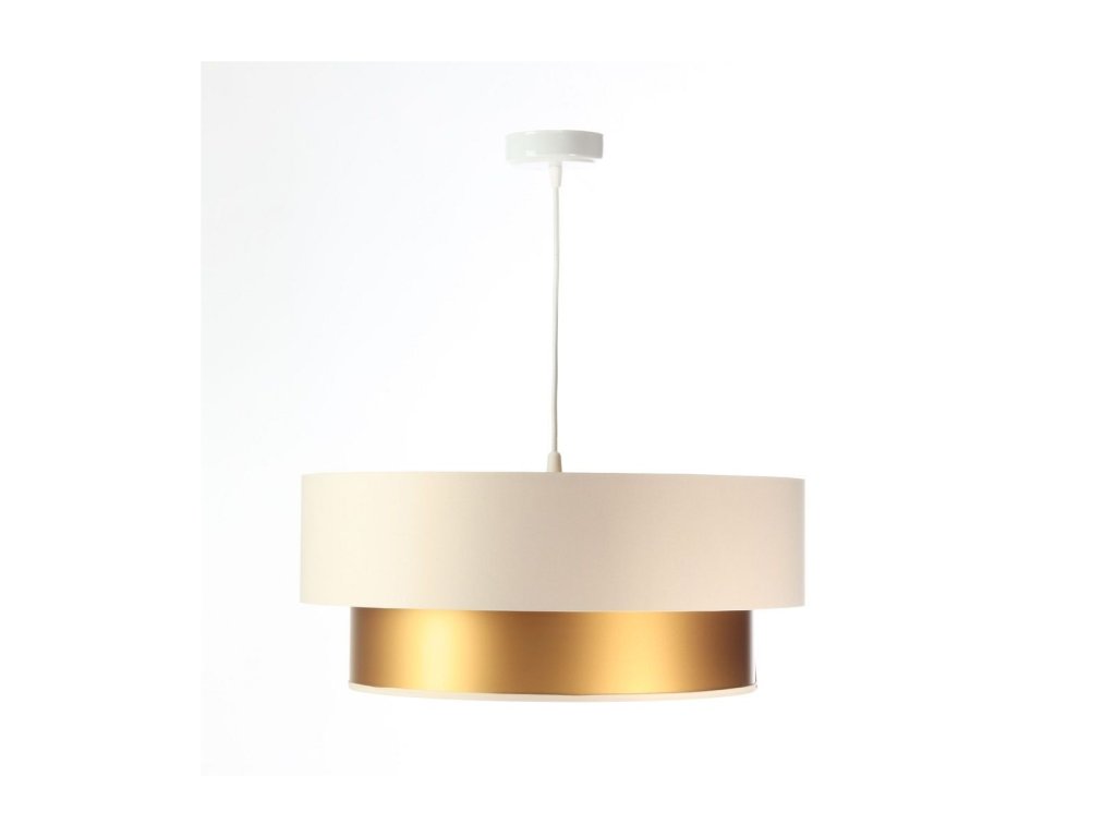 Závesné svietidlo DUO v krémovej farbe v kombinácii s tromi farebnými variantmi - zlatá, strieborná a medená. Tienidlo je odolné voči UV žiareniu, takže tkanina počas používania nevybledne. Priemer svietidla je 60 cm. Skvele sa hodí do obývacej izby či spálne.