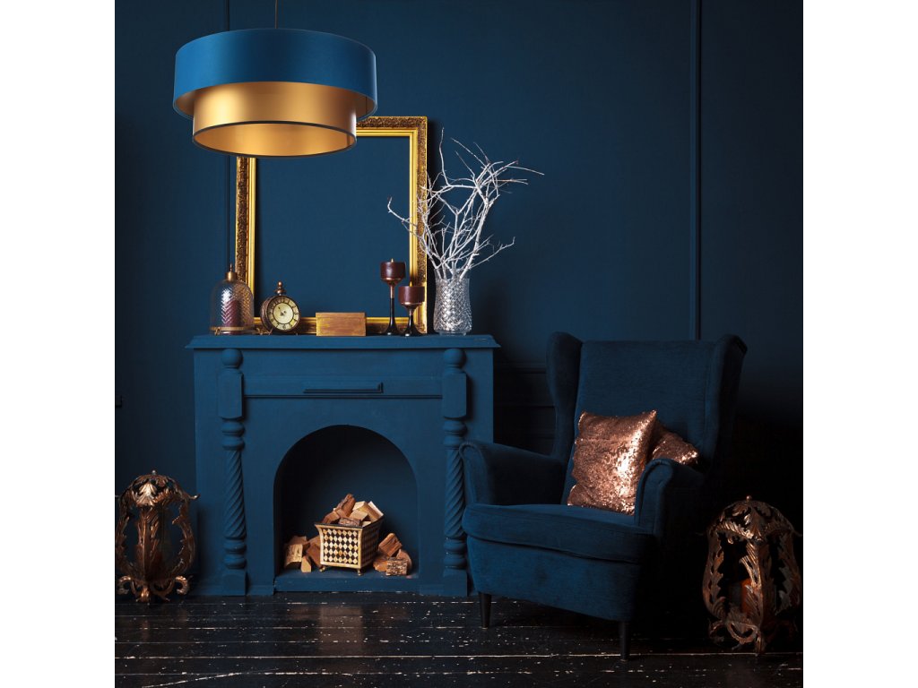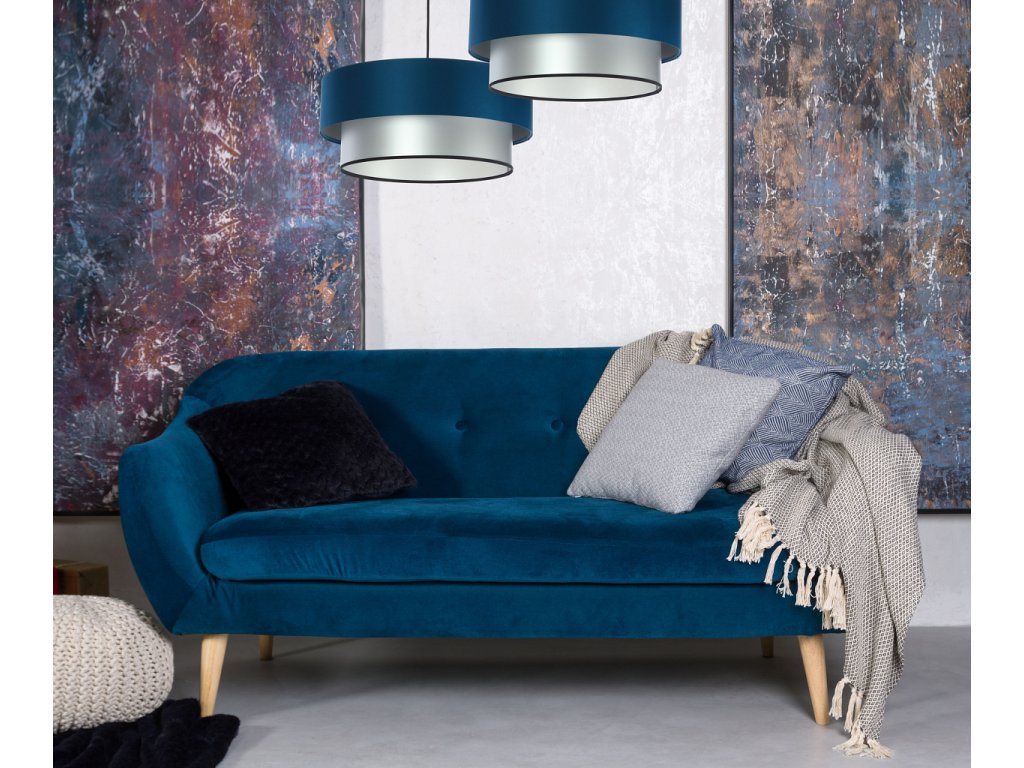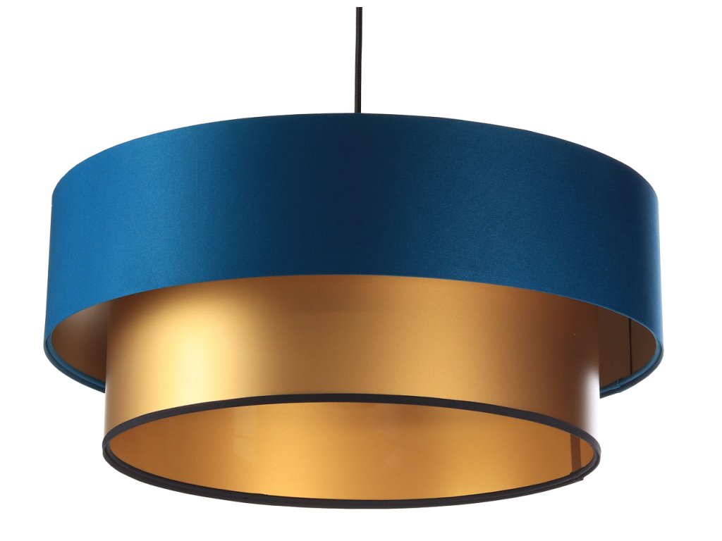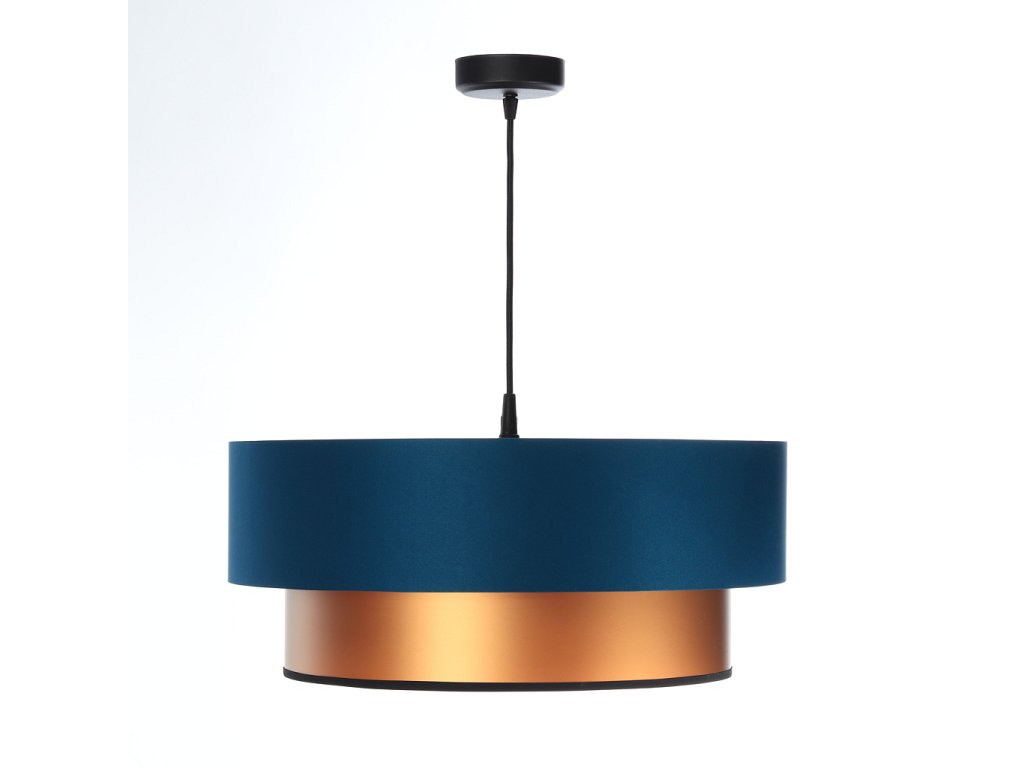 Závesné svietidlo DUO v modrej farbe v kombinácii s tromi farebnými variantmi - zlatá, medená a strieborná. Tienidlo je odolné voči UV žiareniu, takže tkanina počas používania nevybledne. Priemer svietidla je 50 cm. Skvele sa hodí do obývacej izby či spálne.