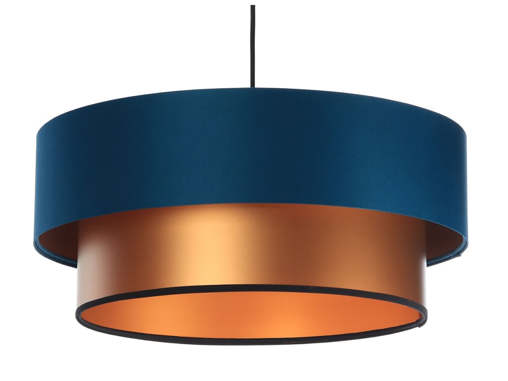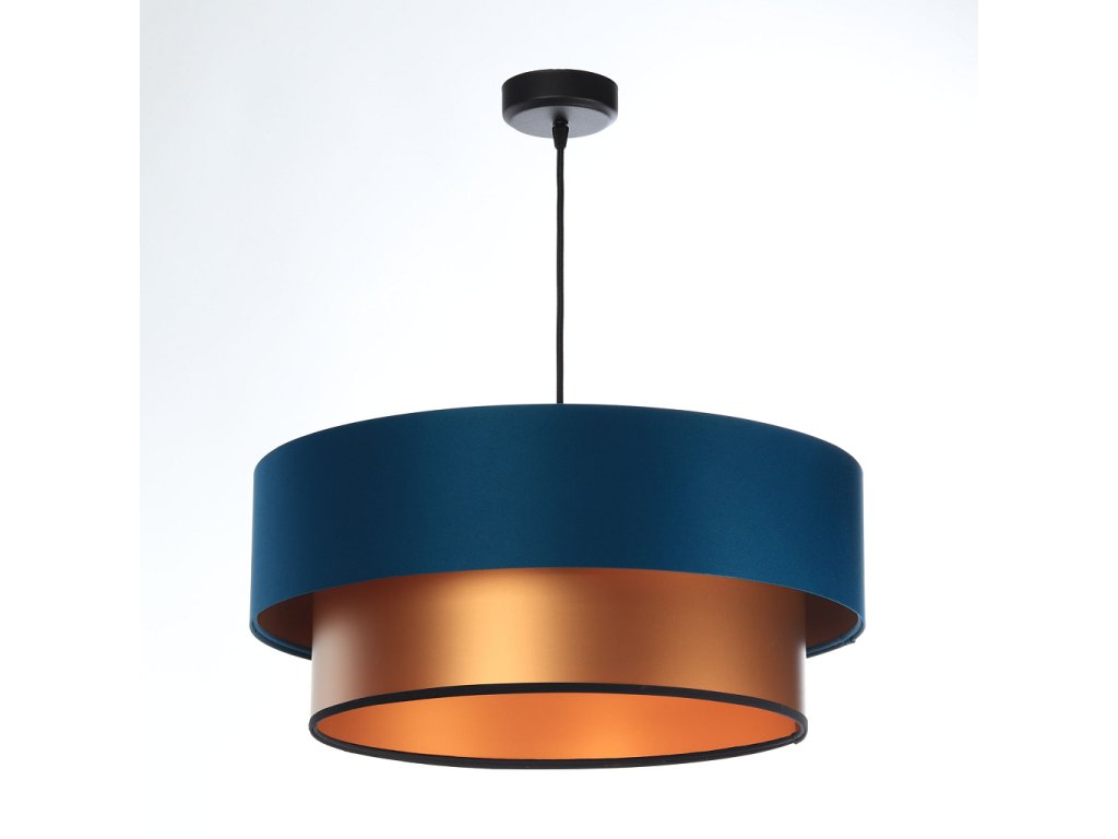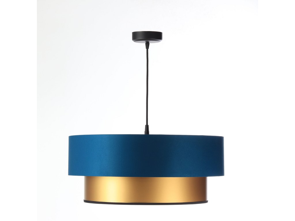Závesné svietidlo DUO v modrej farbe v kombinácii s tromi farebnými variantmi - zlatá, medená a strieborná. Tienidlo je odolné voči UV žiareniu, takže tkanina počas používania nevybledne. Priemer svietidla je 60 cm. Skvele sa hodí do obývacej izby či spálne.