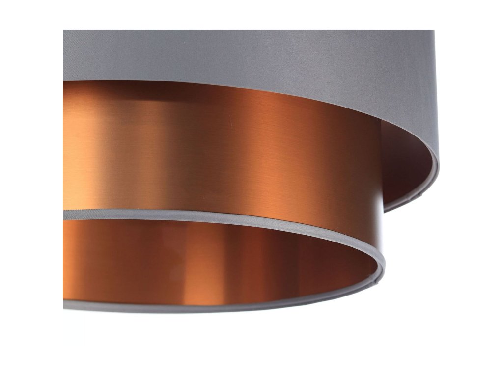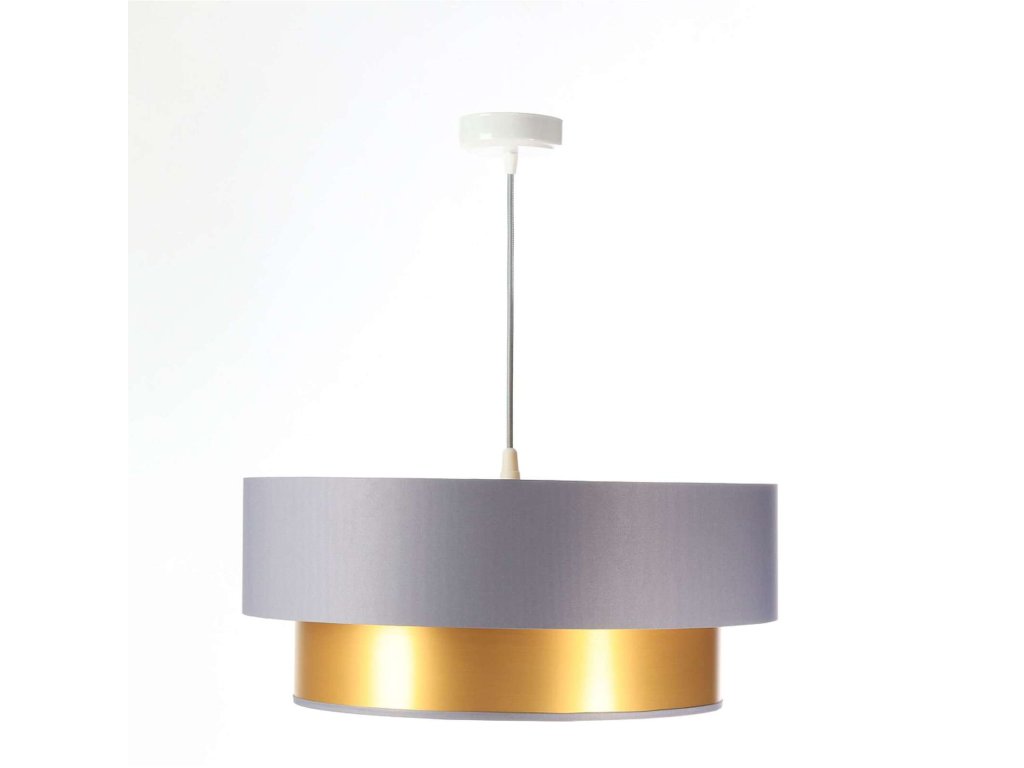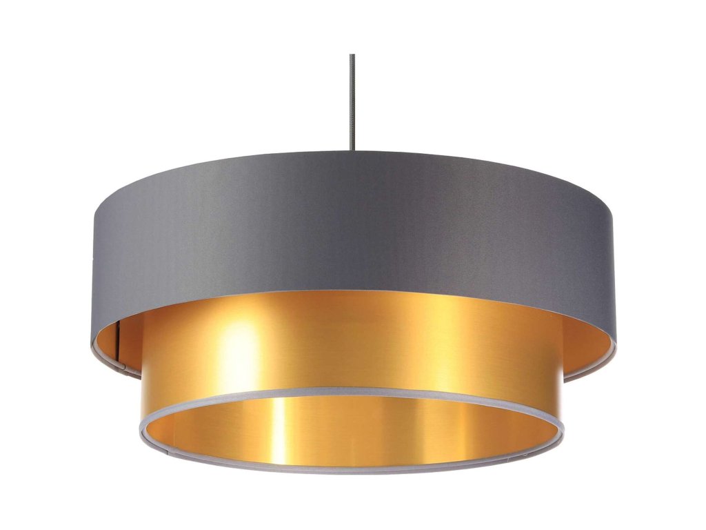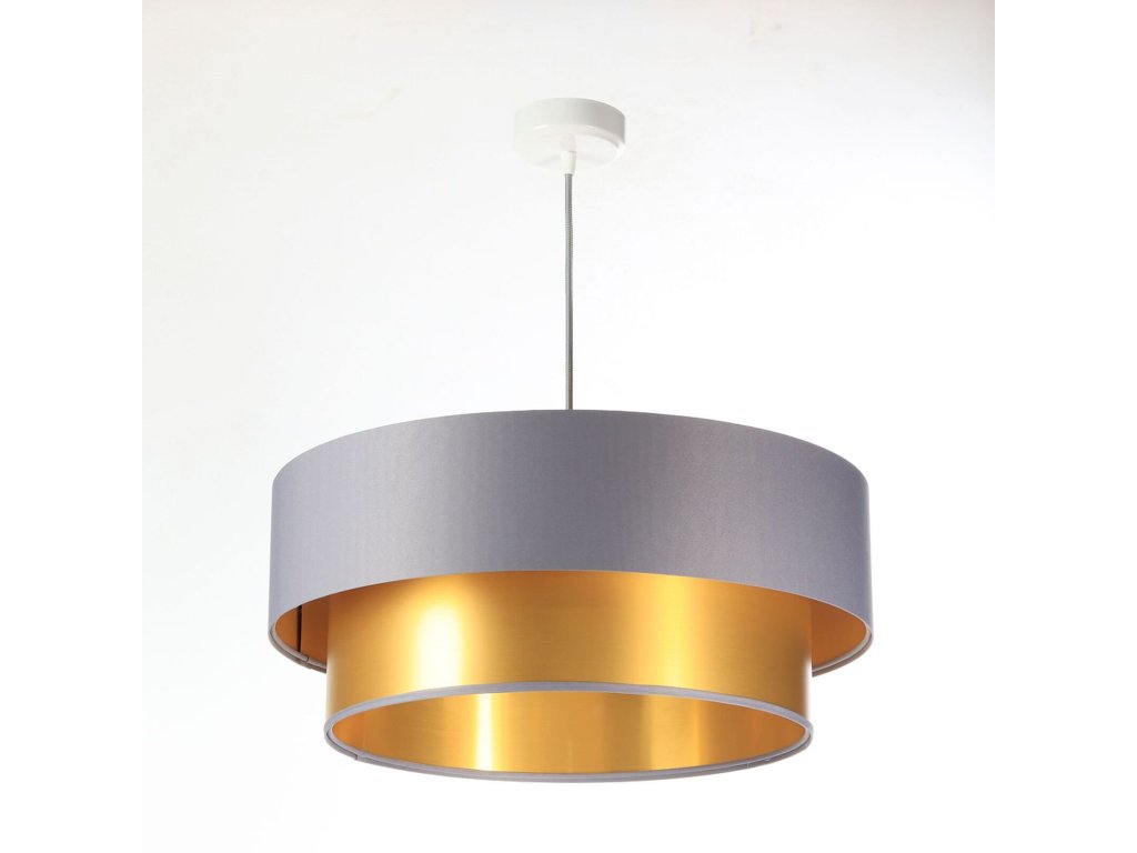 Závesné svietidlo DUO v šedej farbe v kombinácii s tromi farebnými variantmi - zlatá, strieborná a medená. Tienidlo je odolné voči UV žiareniu, takže tkanina počas používania nevybledne. Priemer svietidla je 50 cm. Skvele sa hodí do obývacej izby či spálne.