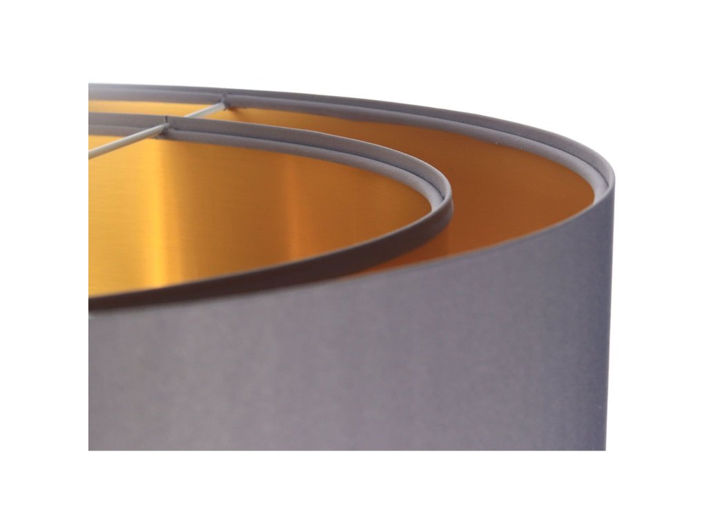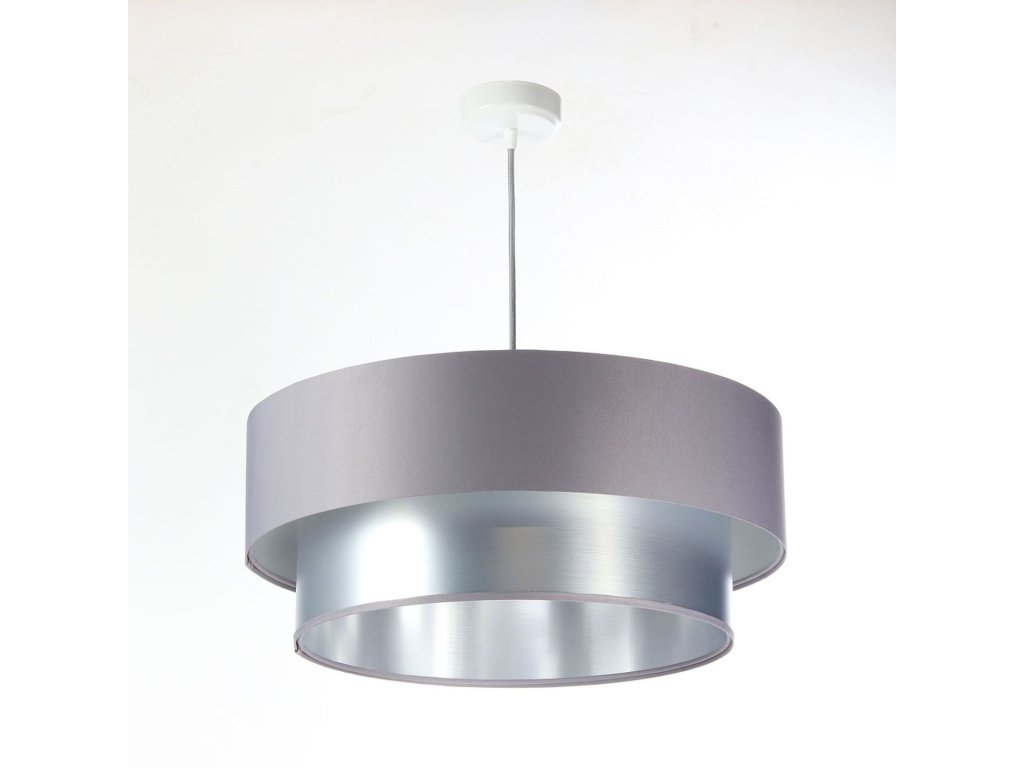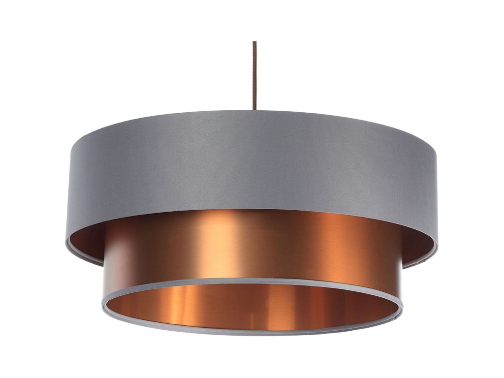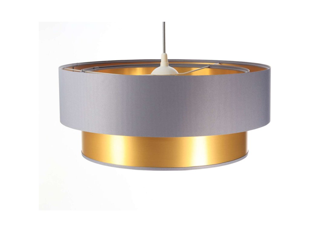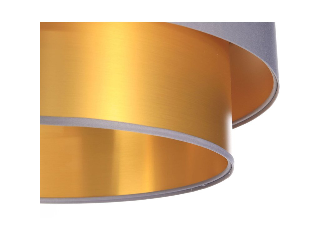 Závesné svietidlo DUO v šedej farbe v kombinácii s tromi farebnými variantmi - zlatá, strieborná a medená. Tienidlo je odolné voči UV žiareniu, takže tkanina počas používania nevybledne. Priemer svietidla je 60 cm. Skvele sa hodí do obývacej izby či spálne.