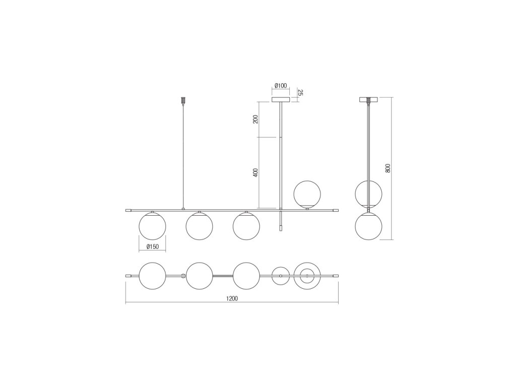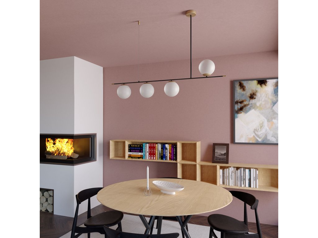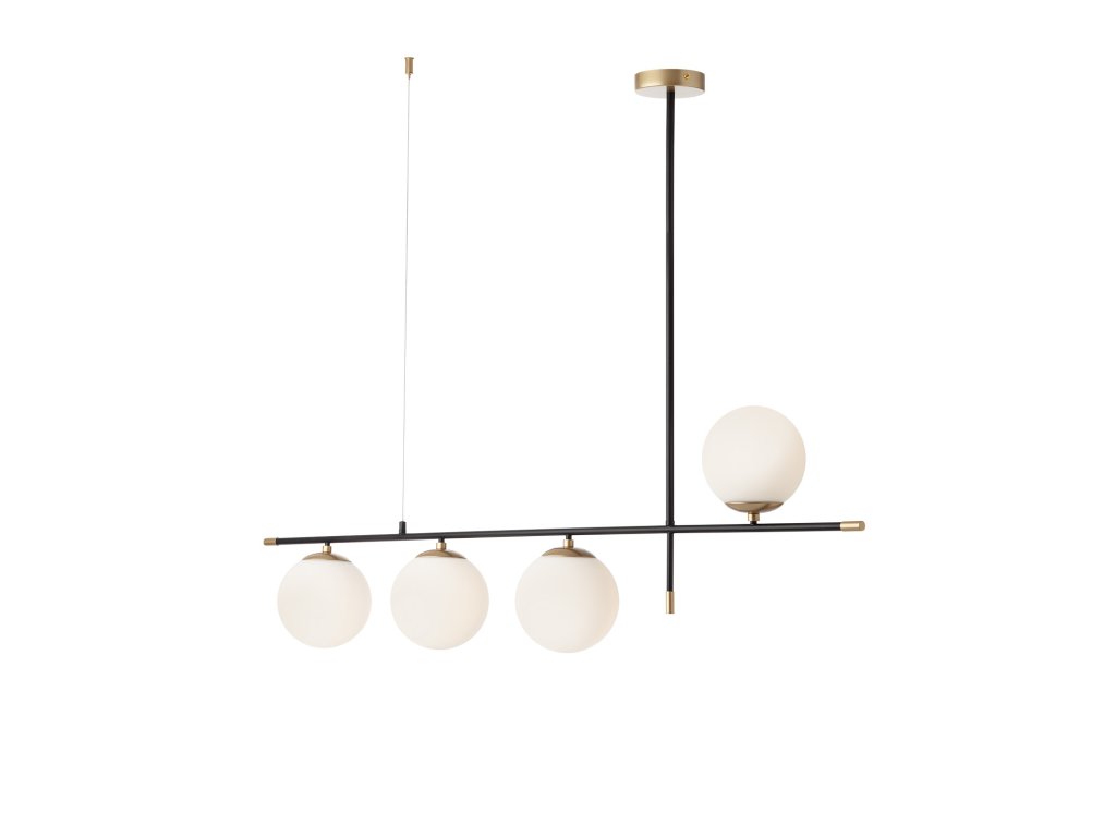 Interiérové závesné svietidlo, kovová konštrukcia lakovaná matnou zlatou a matnou čiernou, tienidlá z opálového fúkaného skla.