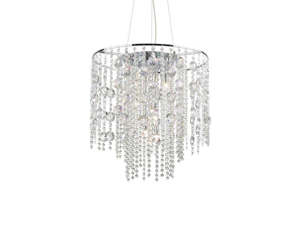Závesný luster Evasione značky Ideal Lux v krištáľovom prevedení s priemerom 51 cm ponúkne ideálne osvetlenie obývacej izby, jedálne či kuchyne. Vďaka svojmu dizajnu sa taktiež hodí do luxusných hotelov a reštaurácií. Okrúhla základňa a rám svetla sú vyrobené z kvalitného kovu s chrómovou povrchovou úpravou. Luster je zdobený krištáľovými závesmi s čírymi sklenenými oveskami rôznych tvarov a veľkostí. Je osadený päticami G9 pre žiarovky s maximálnym príkonom 10 x 40 W. Súčasťou balenia sú LED G9 žiarovky s príkonom 10 x 3 W so svietivosťou 10 x 370 lm a teplotou chromatickosti 3000 K. Výšku zavesenia lustra je možné flexibilne nastaviť podľa potreby pri 5 cm. Krytie IP20 je vhodné na použitie do interiéru. Celkové rozmery svietidla sú 255 x 51 x 51 cm. Je určené na napájanie zo siete na 220-240 V a vzťahuje sa naň predĺžená záruka 5 rokov.Dodatočné parametre
