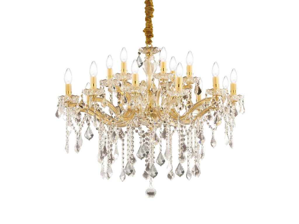 Štýlový krištáľový závesný luster Florian z kolekcie interiérového osvetlenia značky Ideal Lux v najväčšom prevedení s priemerom 86 cm zažiari v akomkoľvek interiéri, jeho dizajn vynikne predovšetkým v priestore s vysokým stropom. Kovový rám s ramenami v zlatej farbe kombinovaný s čírym sklom je ozdobený krištáľovými príveskami v tvare osemuholníkov a kvapiek. Závesná reťaz je potiahnutá zlatým zamatom a dĺžku jej zavesenia je možné ľubovoľne nastaviť pri inštalácii podľa potreby od 95 cm do 123 cm. Luster je osadený päticami E14 s maximálnym príkonom 18 x 40 W. Žiarovky nie sú súčasťou balenia, pre úsporu elektrickej energie odporúčame použiť LED svetelné zdroje v tvare sviečky (typ B35 a BA35). Krytie IP20 je vhodné na použitie do interiéru. Celkové rozmery svietidla sú 123 x 86 x 86 cm. Je určené na napájanie zo siete na 220-240 V a vzťahuje sa naň predĺžená záruka 5 rokov.Dodatočné parametre