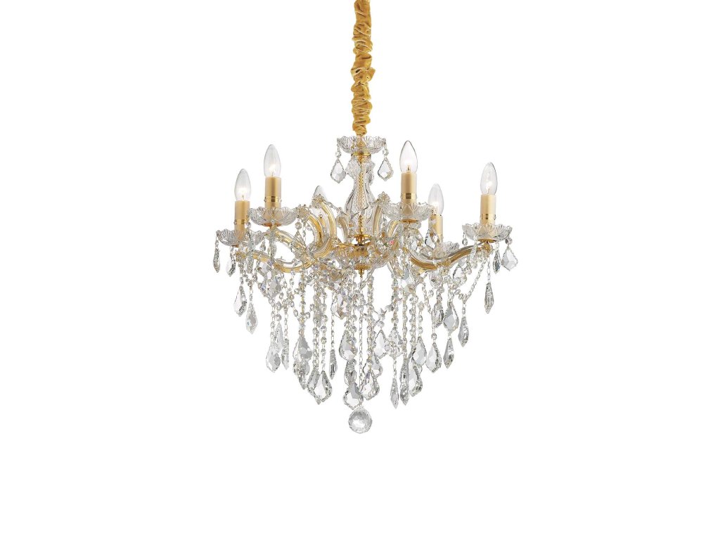 Štýlový krištáľový závesný luster Florian z kolekcie interiérového osvetlenia značky Ideal Lux v menšom prevedení s priemerom 60 cm zažiari v akomkoľvek interiéri, jeho dizajn vynikne predovšetkým v priestore s vysokým stropom. Kovový rám s ramenami v zlatej farbe kombinovaný s čírym sklom je ozdobený krištáľovými príveskami v tvare osemuholníkov a kvapiek. Závesná reťaz je potiahnutá zlatým zamatom a dĺžku zavesenia je možné ľubovoľne nastaviť pri inštalácii podľa potreby od 77 cm do 120 cm. Luster je osadený päticami E14 pre žiarovky s maximálnym príkonom 6 x 40 W. Žiarovky nie sú súčasťou balenia, pre úsporu elektrickej energie odporúčame použiť LED svetelné zdroje v tvare sviečky (typ B35 a BA35). Krytie IP20 je vhodné na použitie do interiéru. Celkové rozmery svietidla sú 120 x 60 x 60 cm. Je určené na napájanie zo siete na 220-240 V a vzťahuje sa naň predĺžená záruka 5 rokov.Dodatočné parametre