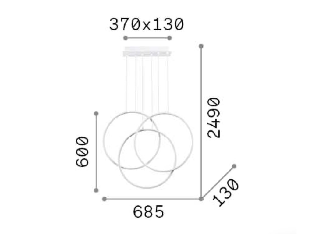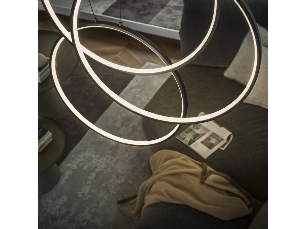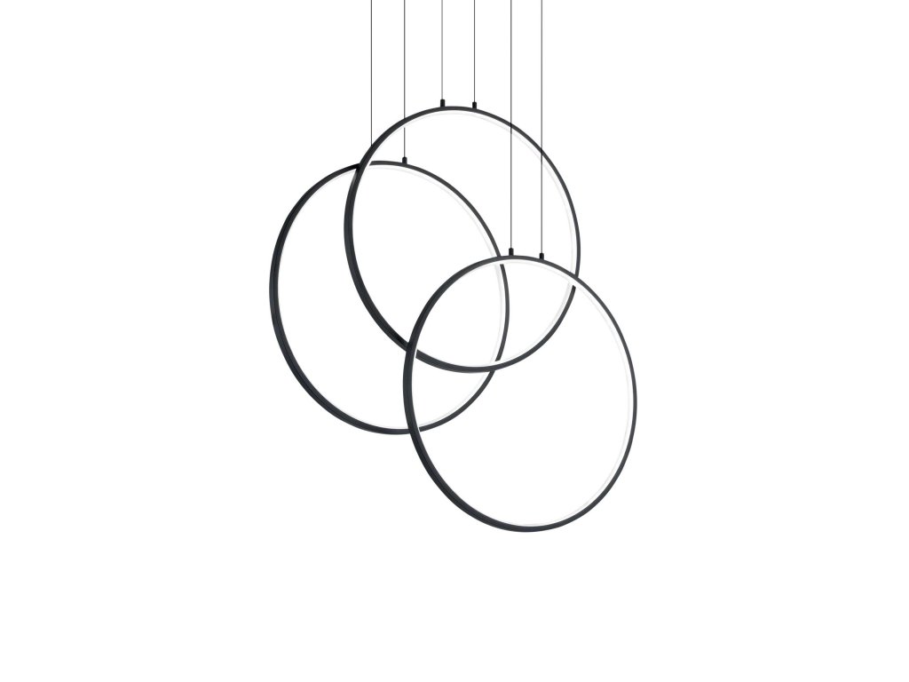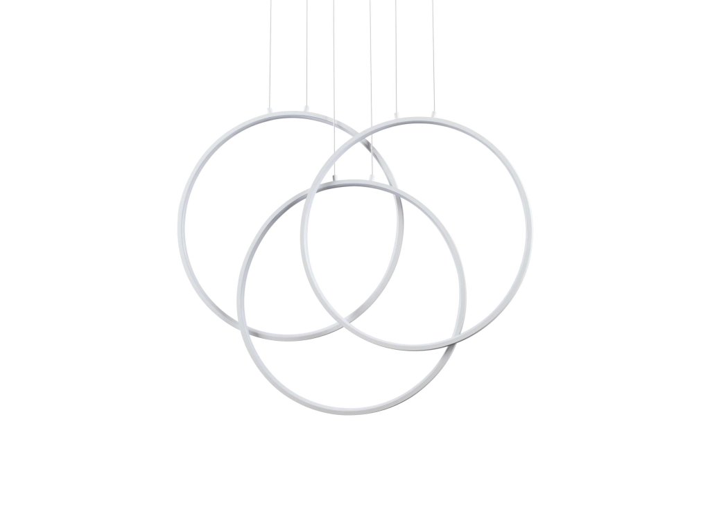 - hranatá základňa a tvarovaný rám svietidla zostavený z troch kruhov je zhotovený z matne čierneho alebo bieleho lakovaného kovu