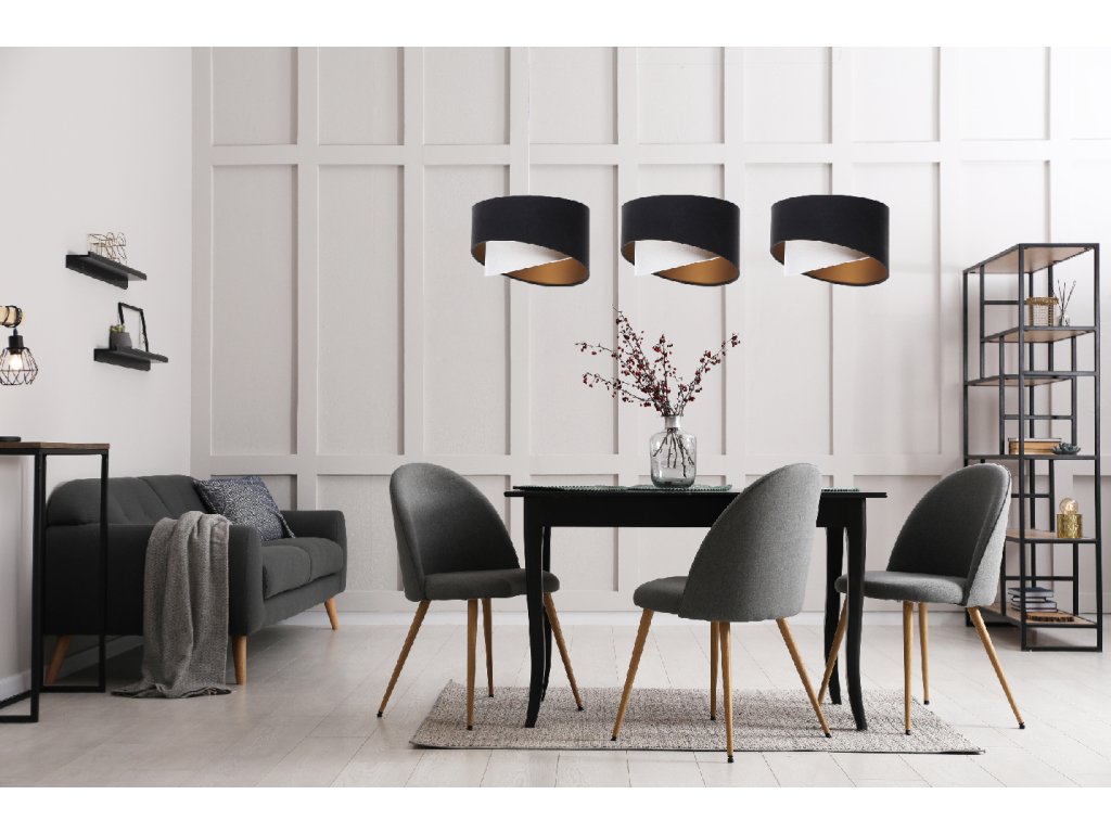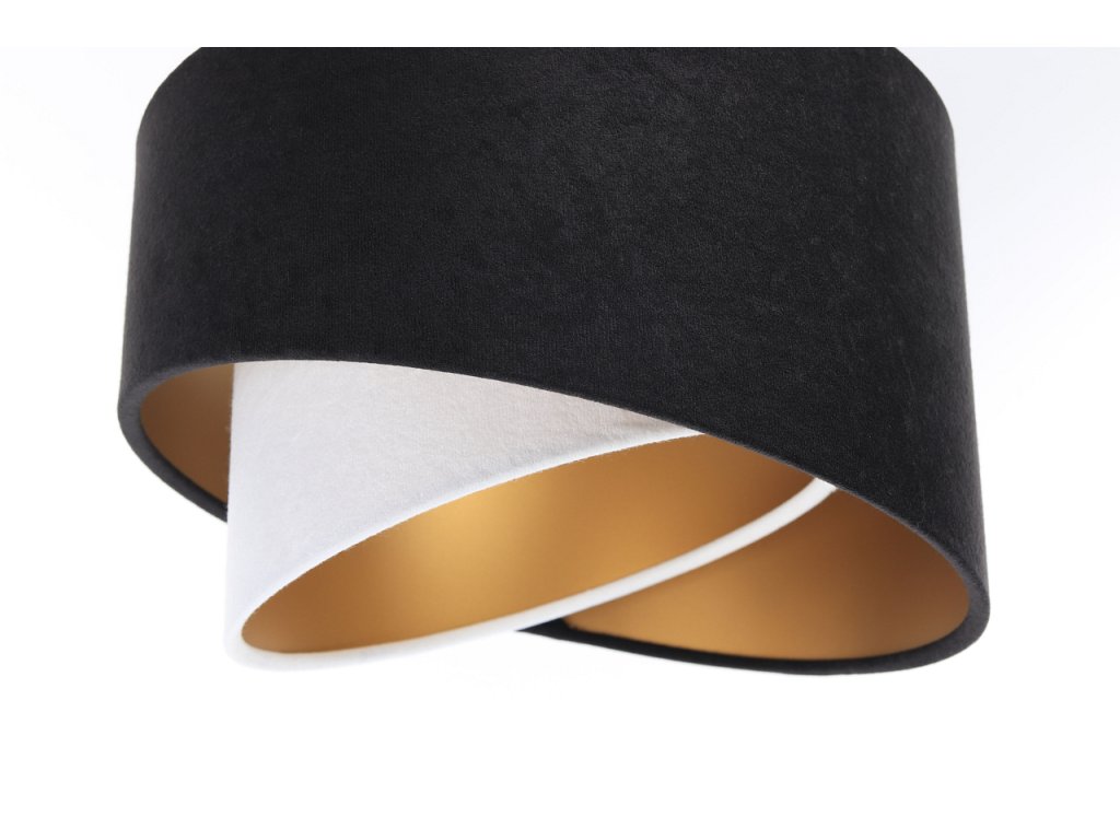 Ručne vyrobené závesné svietidlo Galaxy s tromi svetelnými zdrojmi vyrobené z velúrovej tkaniny v bielo-čierno-zlatom prevedení k dispozícii s bielou či čiernou konštrukciou. Dĺžka svietidla je 87 cm. Skvele sa hodí do obývacej izby, nad jedálenský stôl alebo do spálne.