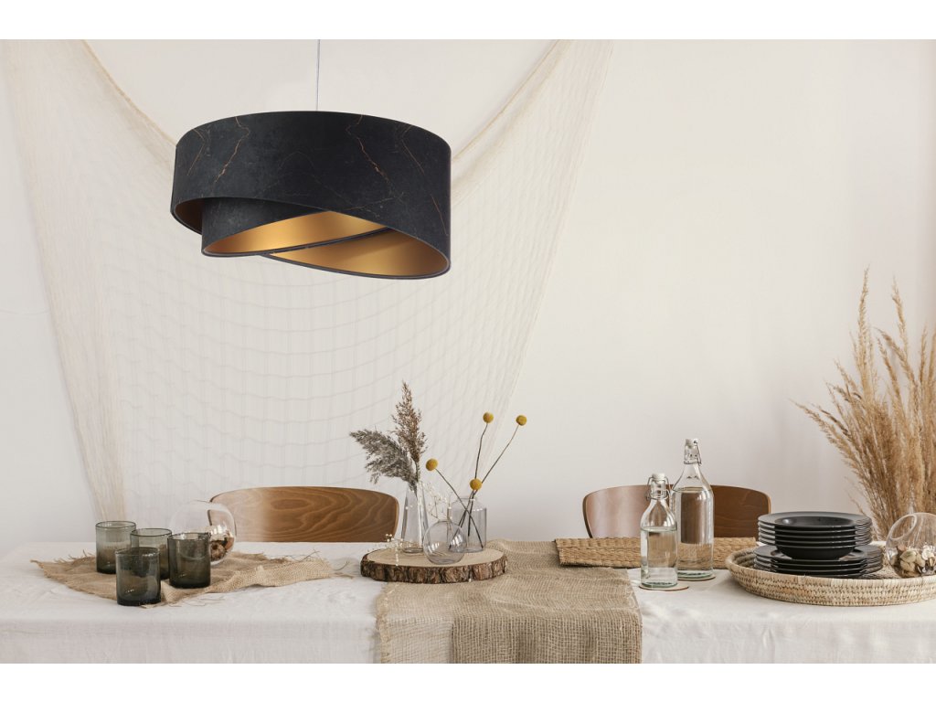 Ručne vyrobené závesné svietidlo Galaxy vyrobené z velúrovej tkaniny v čiernej farbe so zlatou alebo striebornou farbou z vnútornej strany svietidla. Priemer svietidla je 50 cm. Skvele sa hodí do obývacej izby, nad jedálenský stôl alebo do spálne.