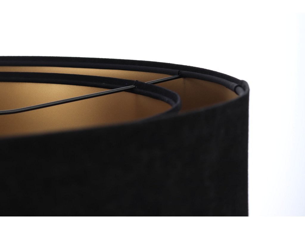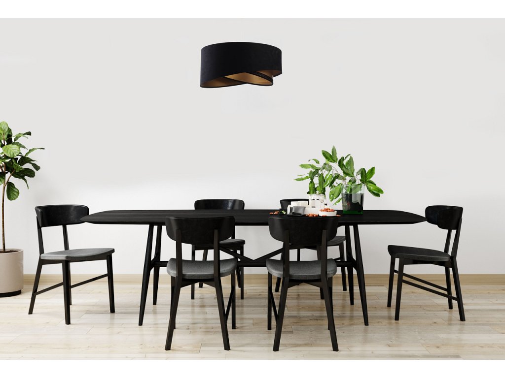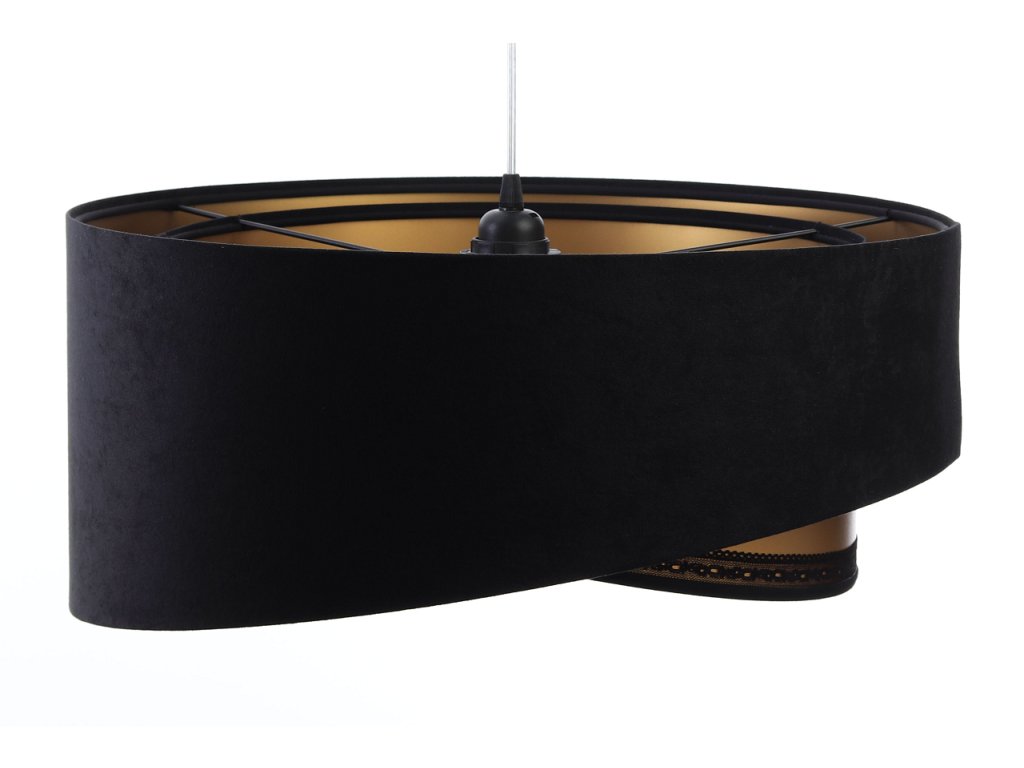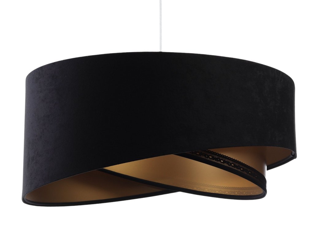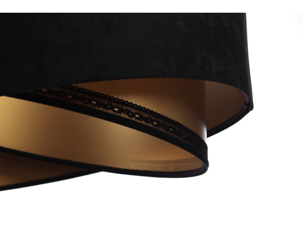 Ručne vyrobené závesné svietidlo Galaxy vyrobené z velúrovej tkaniny v čierno-zlatej farbe s čipkou. Priemer svietidla je 50 cm. Skvele sa hodí do obývacej izby, nad jedálenský stôl alebo do spálne.