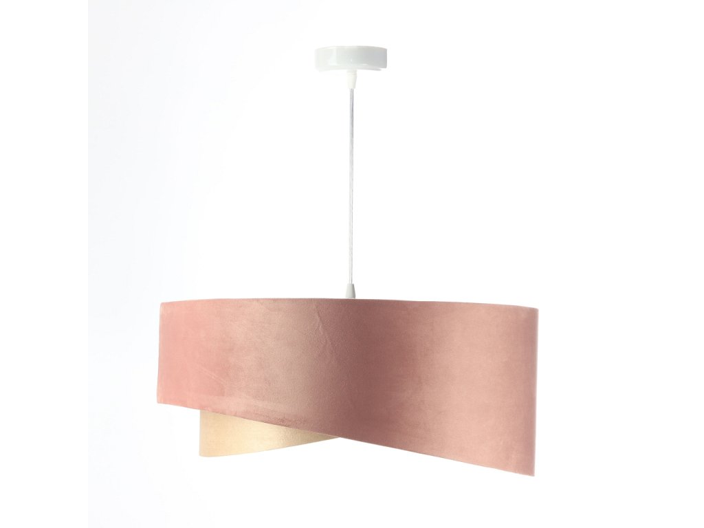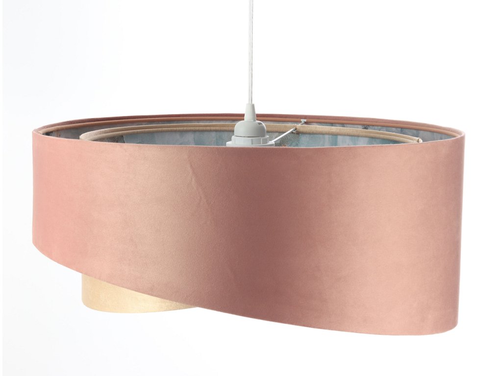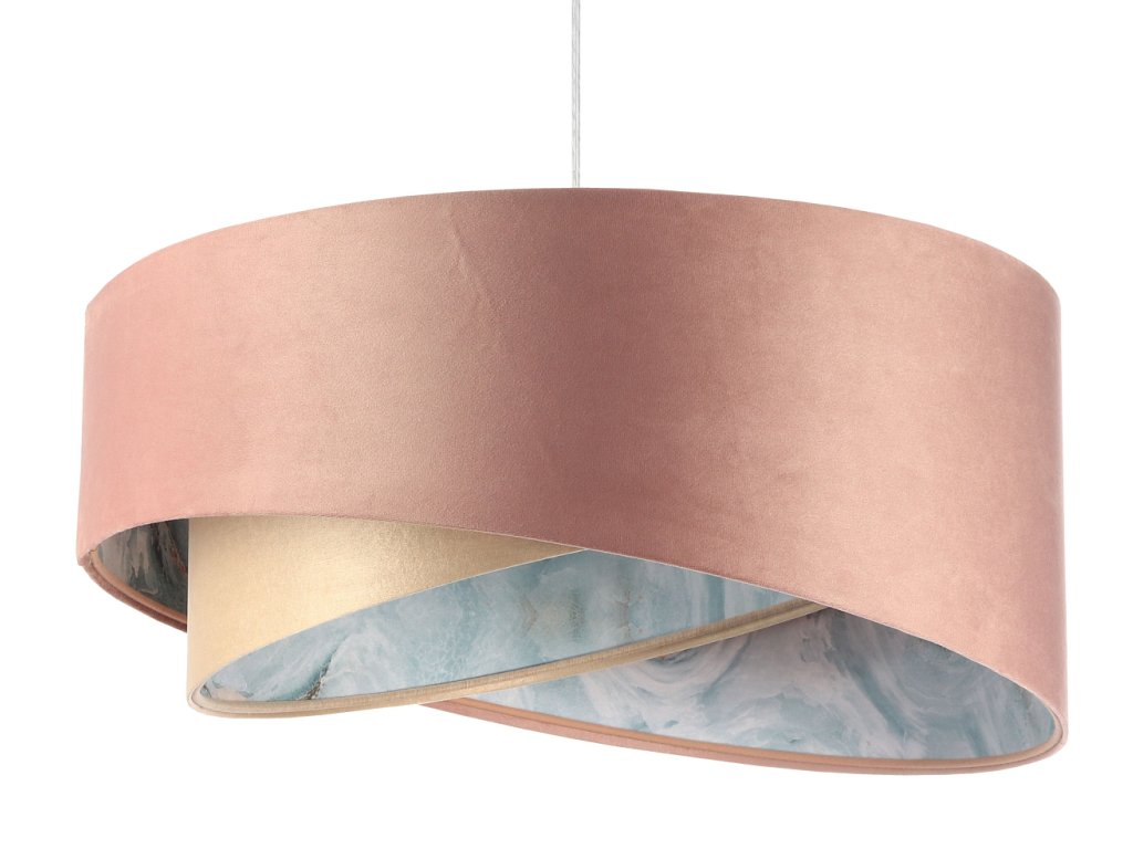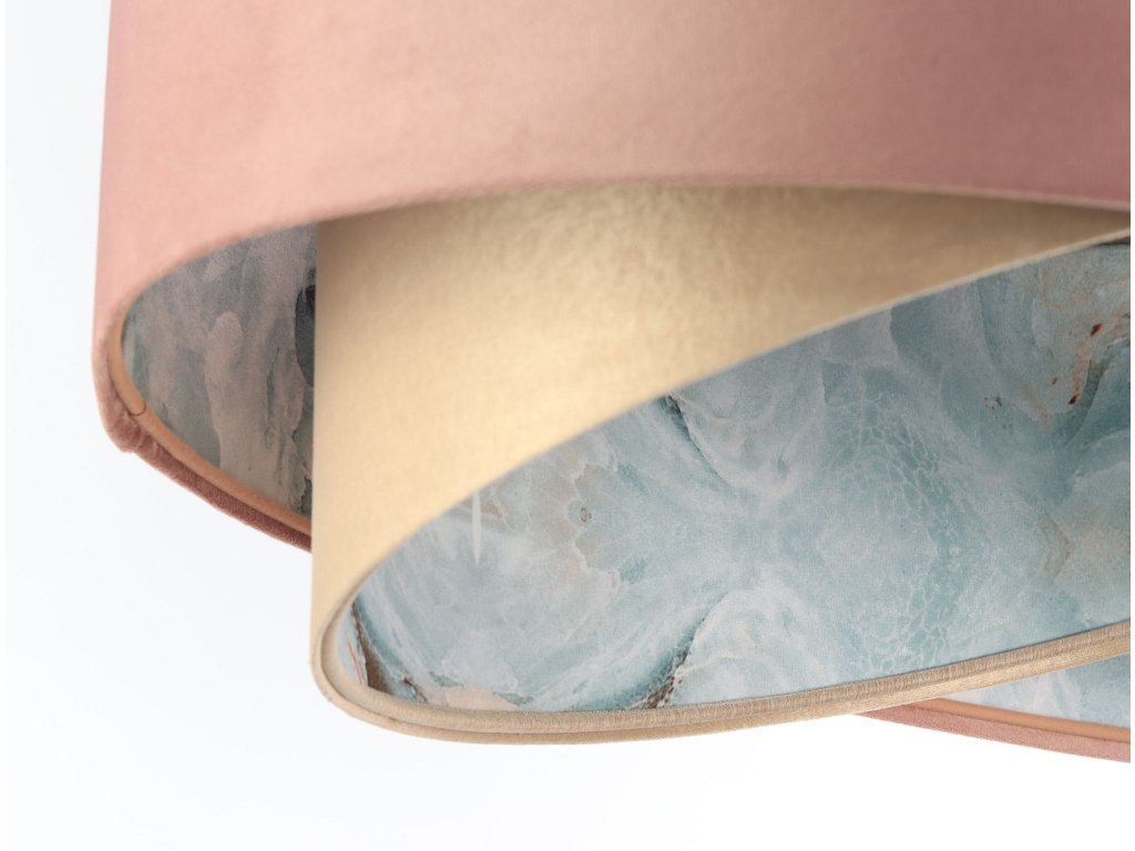 Ručne vyrobené závesné svietidlo Galaxy vyrobené z velúrovej tkaniny v ružovo-béžovej s modrým dizajnom z vnútornej strany tienidla. Priemer svietidla je 50 cm. Skvele sa hodí do obývacej izby, nad jedálenský stôl alebo do spálne.