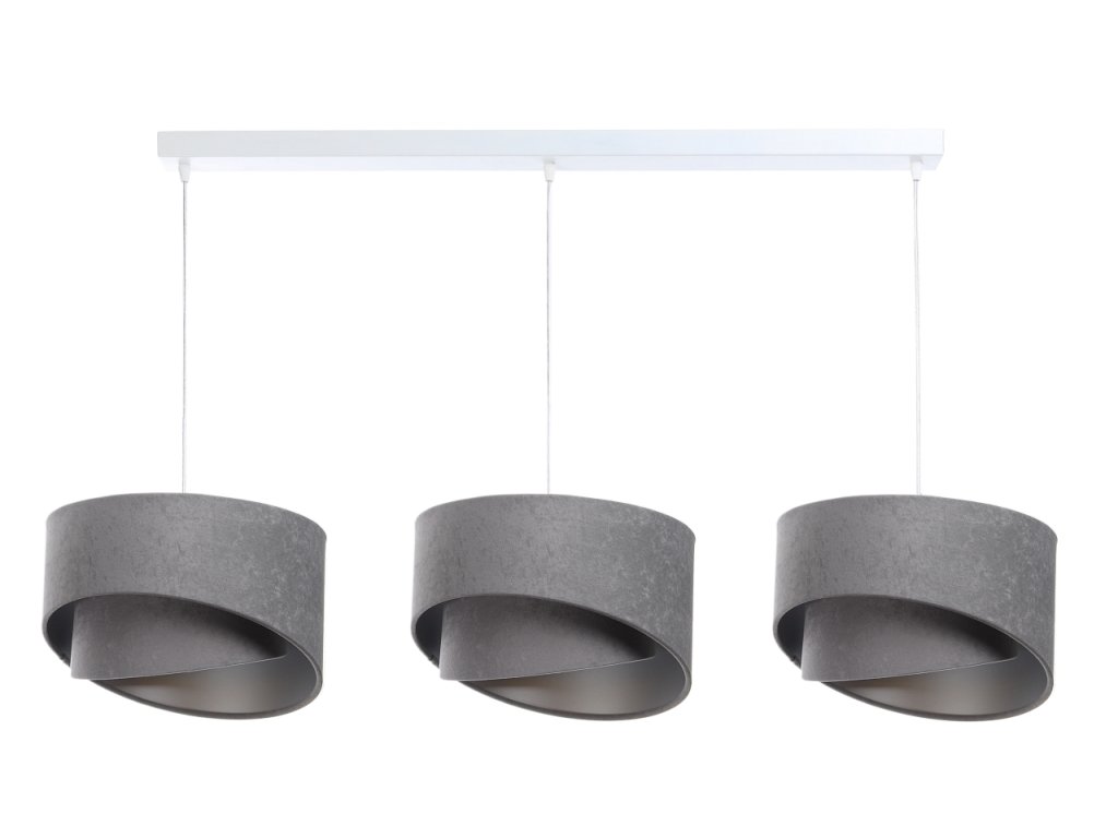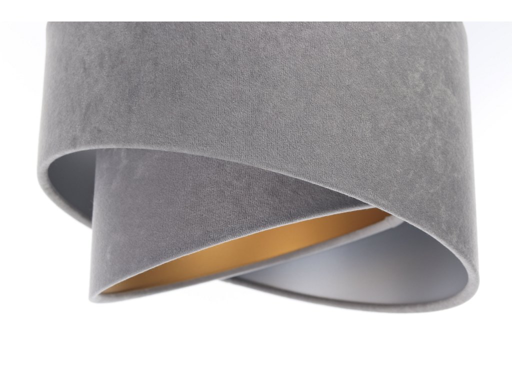 Ručne vyrobené závesné svietidlo Galaxy s tromi svetelnými zdrojmi vyrobené z velúrovej tkaniny v šedej so zlatou farbou z vnútornej strany tienidla. Dĺžka svietidla je 87 cm. Skvele sa hodí do obývacej izby, nad jedálenský stôl alebo do spálne.