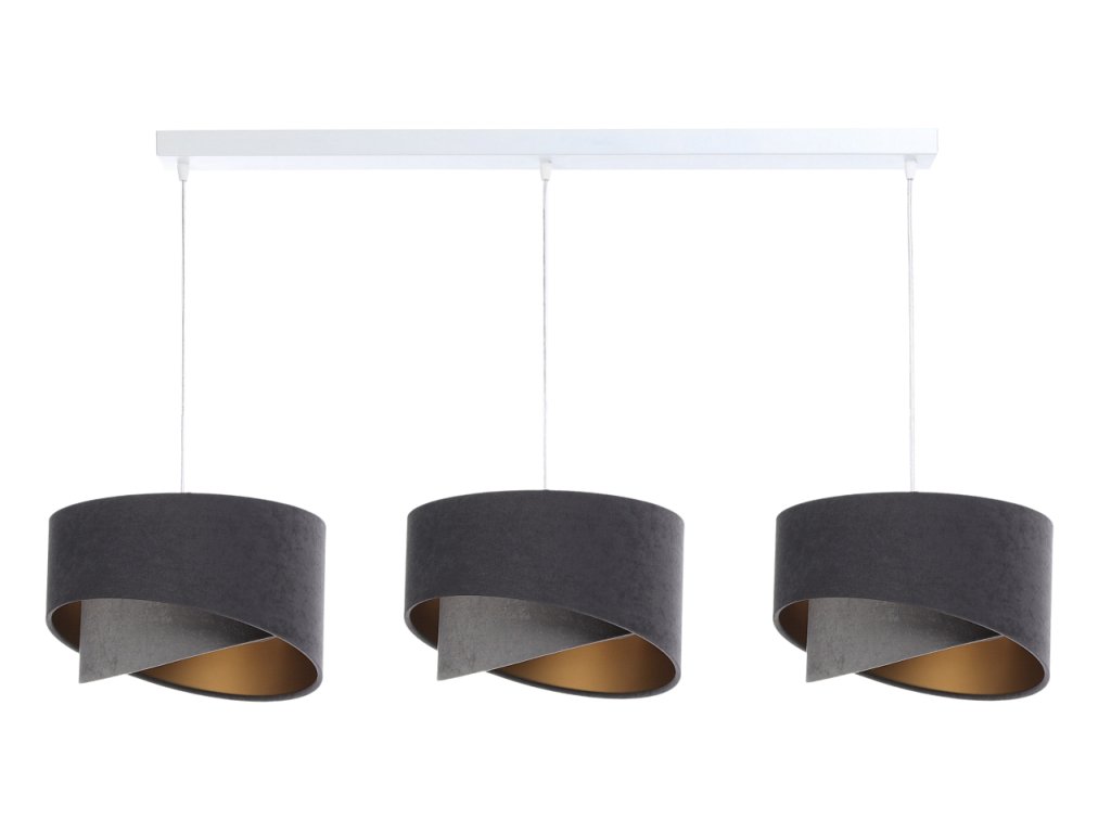 Ručne vyrobené závesné svietidlo Galaxy s tromi svetelnými zdrojmi vyrobené z velúrovej tkaniny v tmavo šedej farbe v kombinácii so svetlo šedou farbou a zlatou farbou z vnútornej strany tienidla Dĺžka svietidla činí 87 cm.