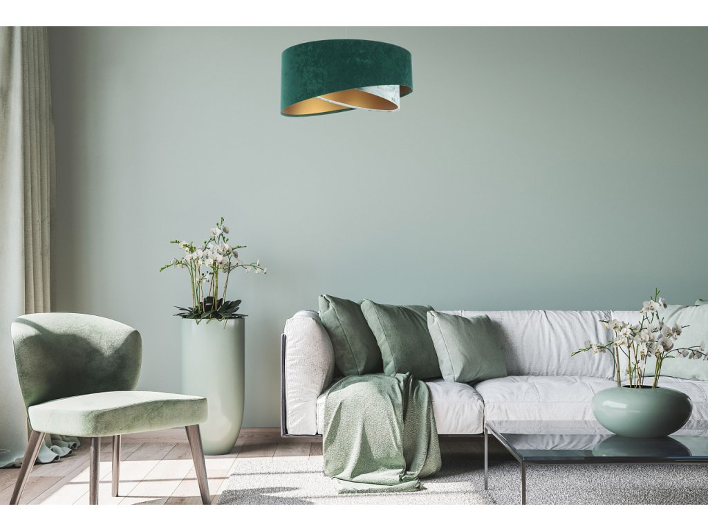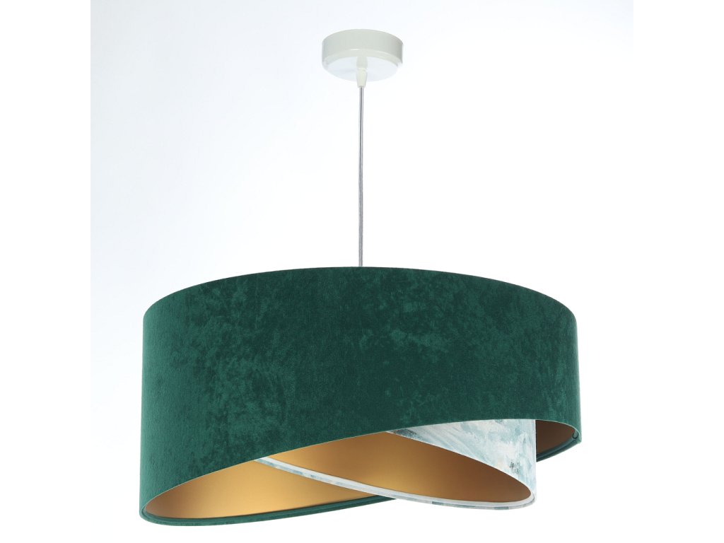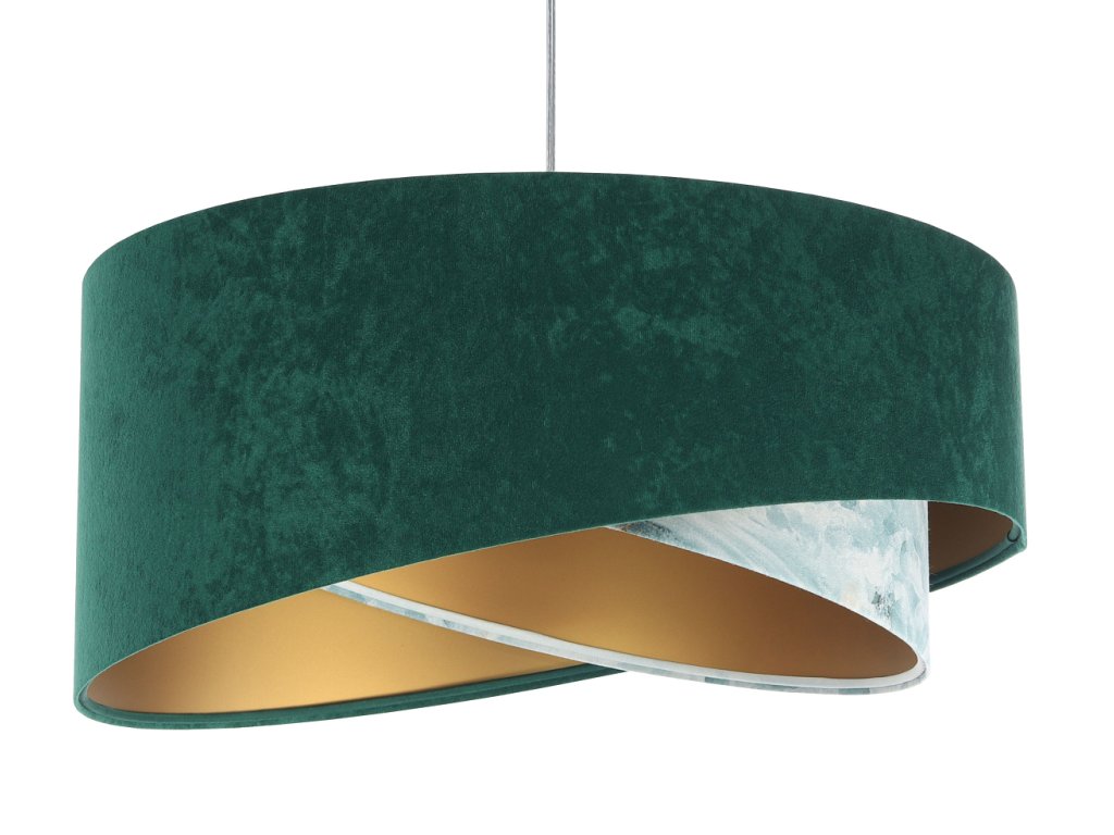 Ručne vyrobené závesné svietidlo Galaxy vyrobené z velúrovej tkaniny v zelenej farbe v kombinácii so vzorom. Priemer svietidla je 50 cm. Skvele sa hodí do obývacej izby, nad jedálenský stôl alebo do spálne.
