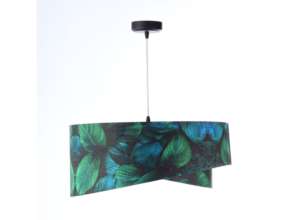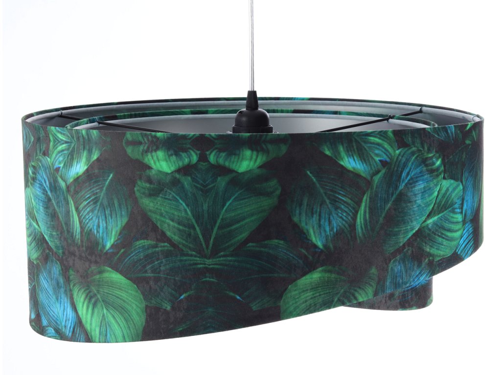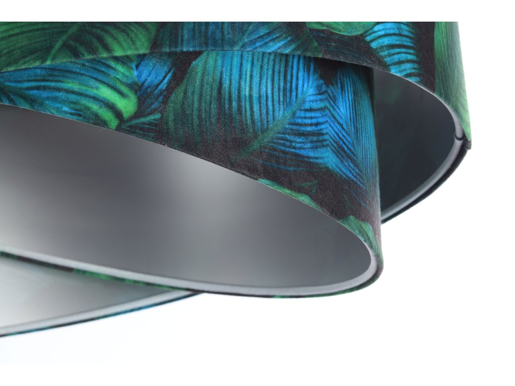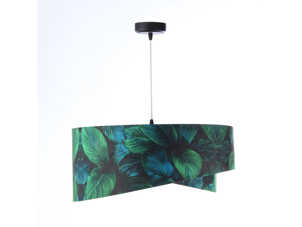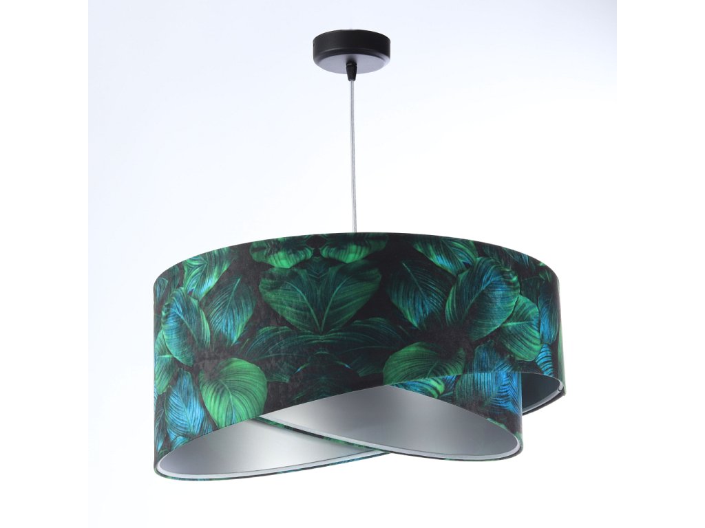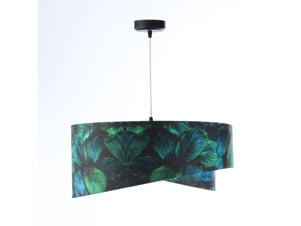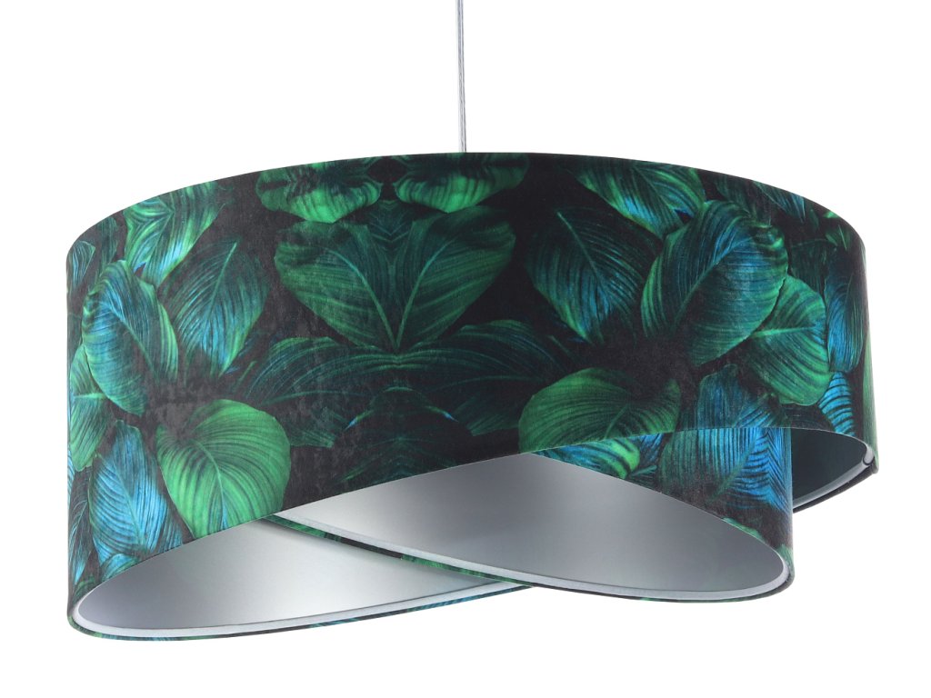 Ručne vyrobené závesné svietidlo Galaxy vyrobené z velúrovej tkaniny so vzorom zelených listov. Priemer svietidla je 50 cm. Skvele sa hodí do obývacej izby, nad jedálenský stôl alebo do spálne.