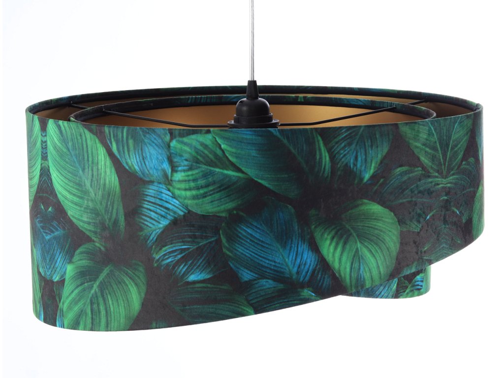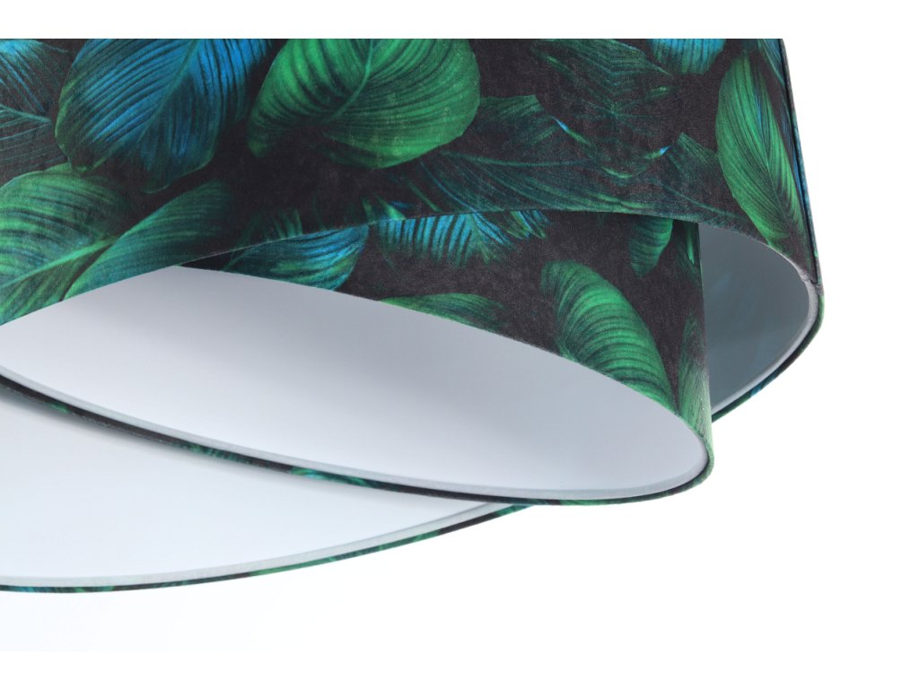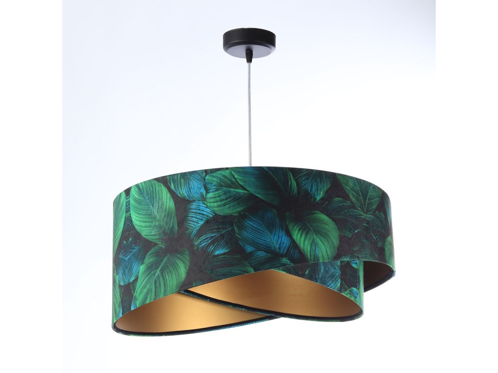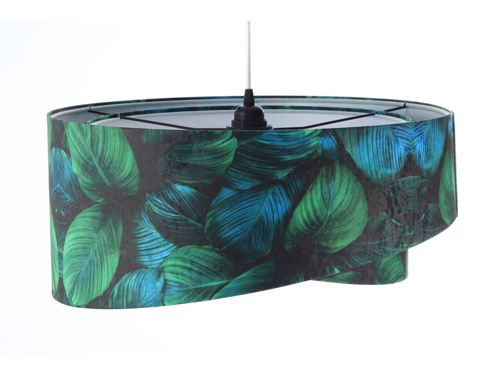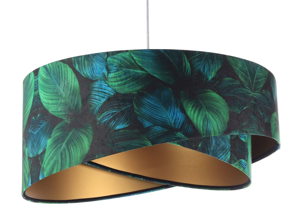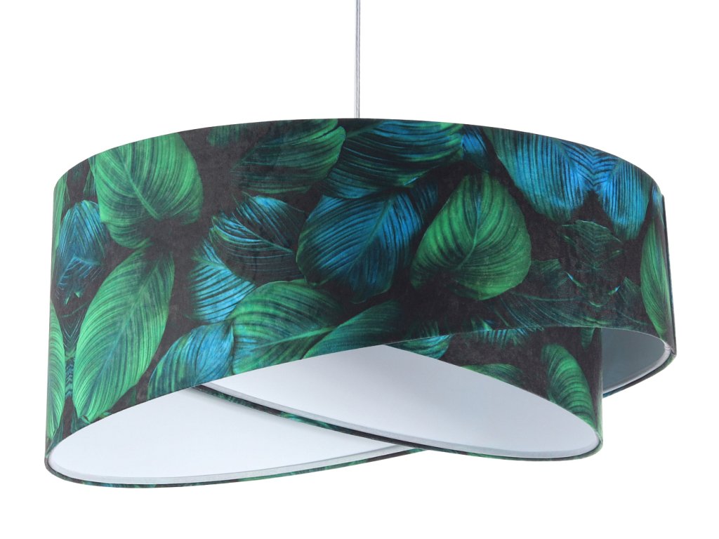 Ručne vyrobené závesné svietidlo Galaxy vyrobené z velúrovej tkaniny so vzorom zelených listov. Priemer svietidla je 50 cm. Skvele sa hodí do obývacej izby, nad jedálenský stôl alebo do spálne.