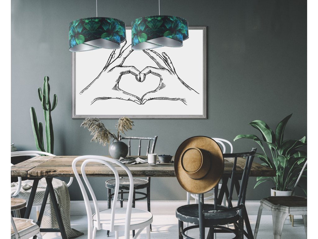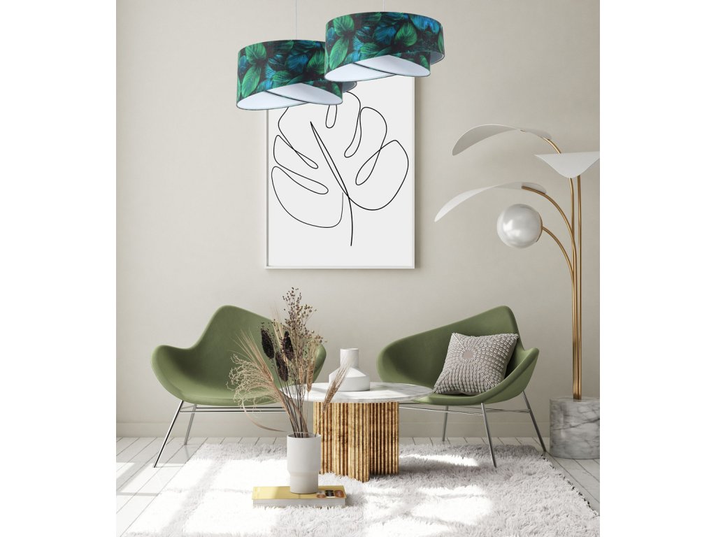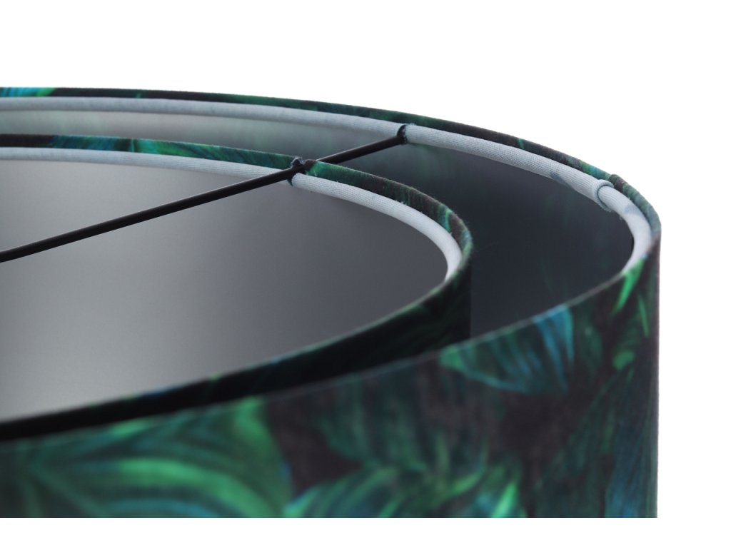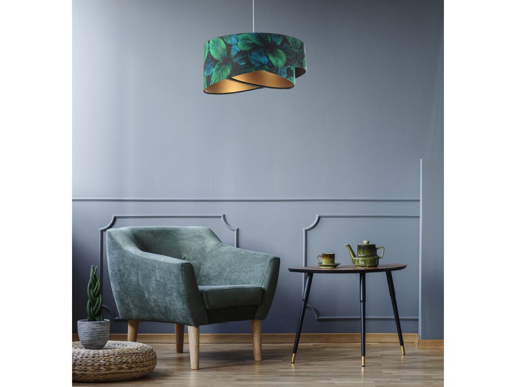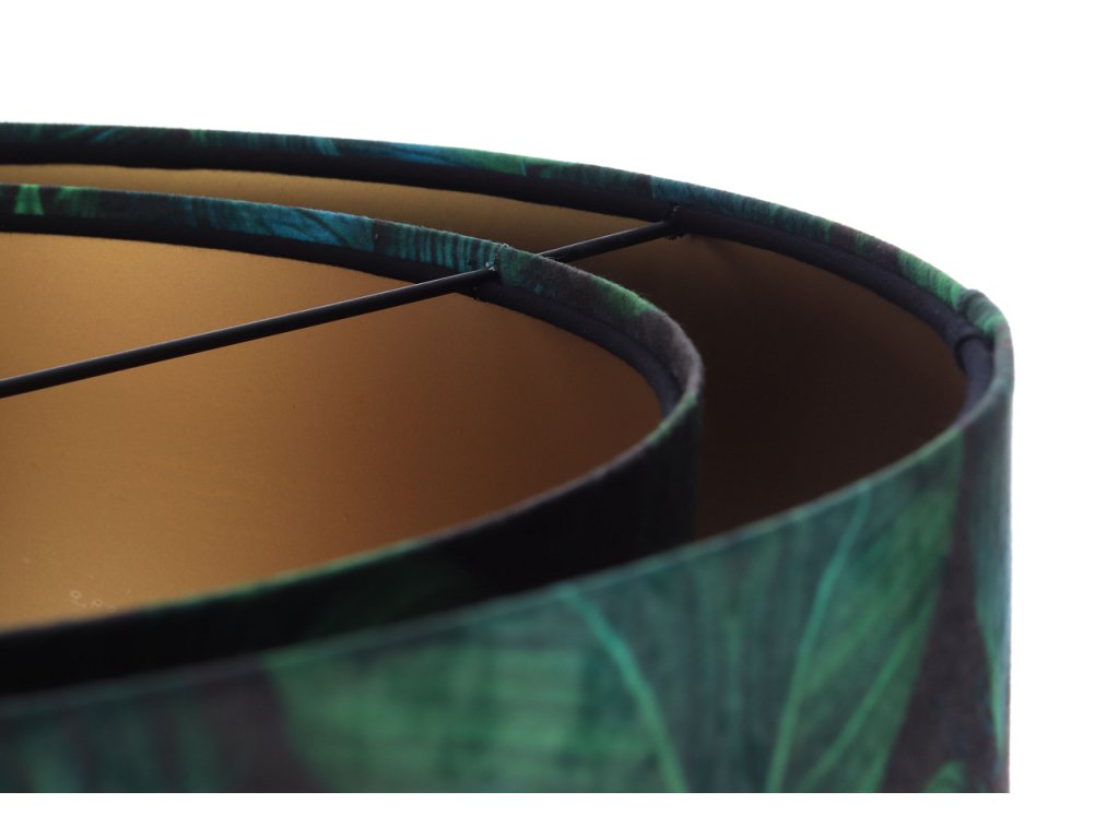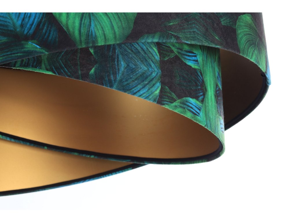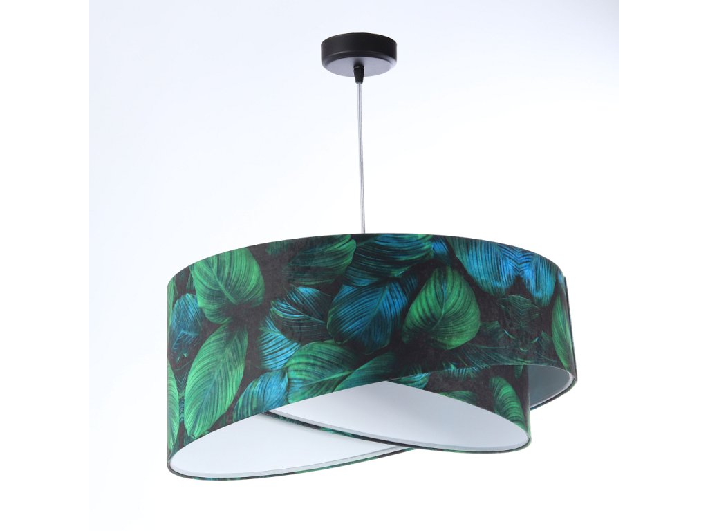 Ručne vyrobené závesné svietidlo Galaxy vyrobené z velúrovej tkaniny so vzorom zelených listov. Priemer svietidla je 50 cm. Skvele sa hodí do obývacej izby, nad jedálenský stôl alebo do spálne.