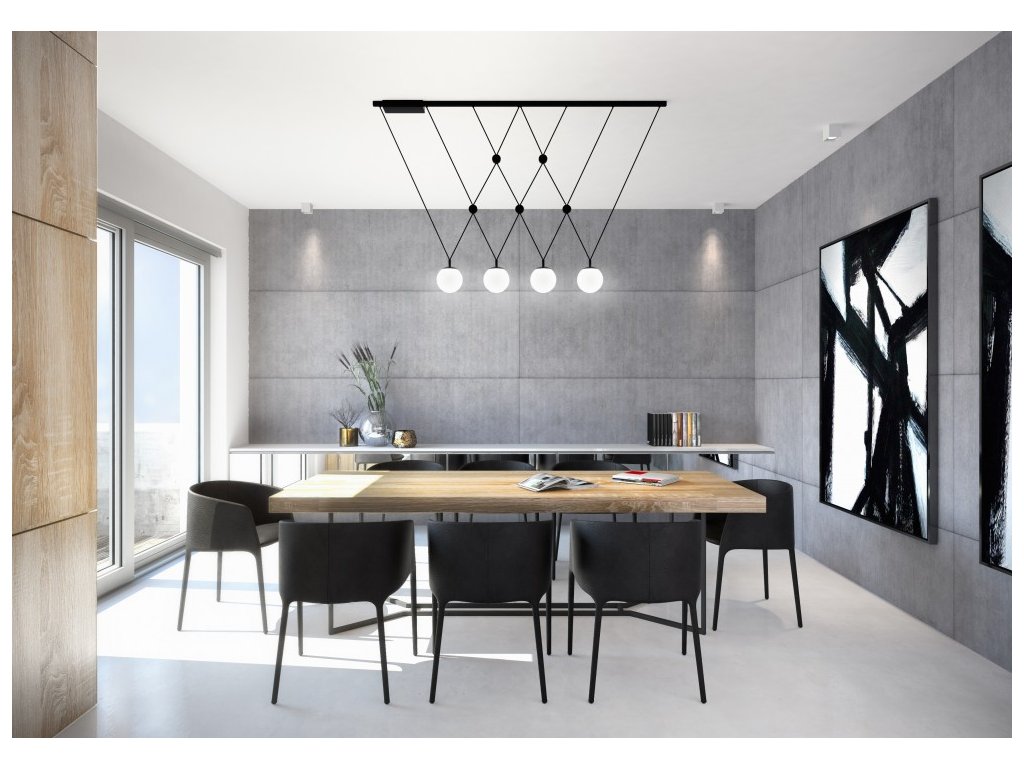 Dizajnové závesné svietidlo GEO vyrobené z ocele v čiernej farbe s matne opálovým ručne fúkaným difúzorom z trojvrstvového skla. Rozmery svietidla činia v95xš170 cm. Priemer tienidla je 15 cm. Toto výnimočné svietidlo sa skvele hodí do obývacej izby, kuchyne, nad jedálenský stôl alebo do spálne.