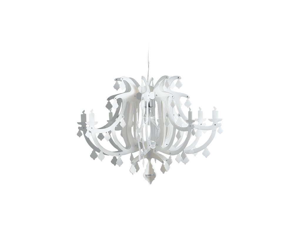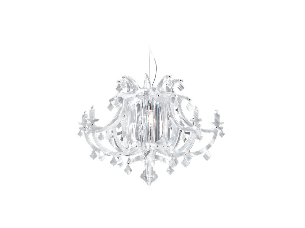 Klasický osemramenný luster prešiel digitálnou evolúciou; honosný moderný tvar lustra Ginetta vychádza z centrálneho svetelného zdroja, ktorý vrhá elegantné, rafinované odlesky a hodí sa do modernej aj aristokratickej atmosféry. Valcový difúzor z dúhového polykarbonátu je obklopený možnosťou výberu z troch povrchových úprav: kov, prisma alebo Opalflex®.
