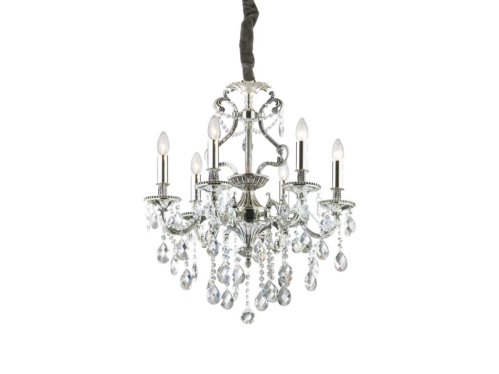 Závesné svietidlo Gioconda z kolekcie interiérového osvetlenia značky Ideal Lux s klasickým krištáľovým dizajnom a priemerom 62 cm dokonale zapadne do vašej obývačky, kuchyne či jedálne. Je zároveň vhodné na osvietenie miestností s vysokými stropmi luxusných víl, hotelov a reštaurácií. Základňa a rám svietidla sú zhotovené z liateho kovu so striebornou povrchovou úpravou a starožitným efektom. Šesť ramien je zdobených osemhrannými a okrúhlymi brúsenými krištáľmi. Prívodná reťaz je krytá zamatovou tkaninou. Výšku závesu je možné regulovať od 93 cm do 118 cm. Svietidlo je osadené päticami E14 pre žiarovky s maximálnym príkonom 6 x 40 W. Zdroje nie sú súčasťou balenia. Odporúčame zvoliť LED žiarovky na úsporu elektrickej energie. Krytie IP20 je vhodné pre vnútornú inštaláciu. Celkové rozmery svietidla sú 118 x 62 x 62 cm. Je určené na napájanie zo siete na 220-240 V a vzťahuje sa naň predĺžená záruka 5 rokov.Dodatočné parametre