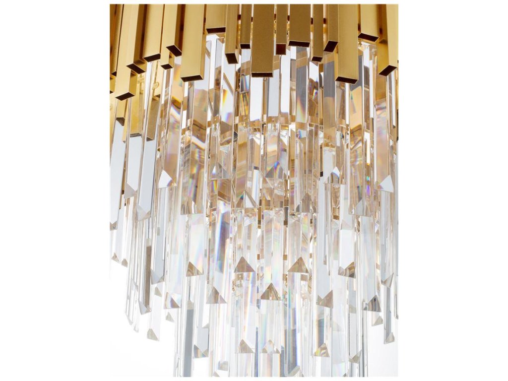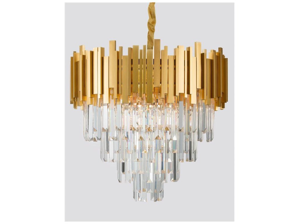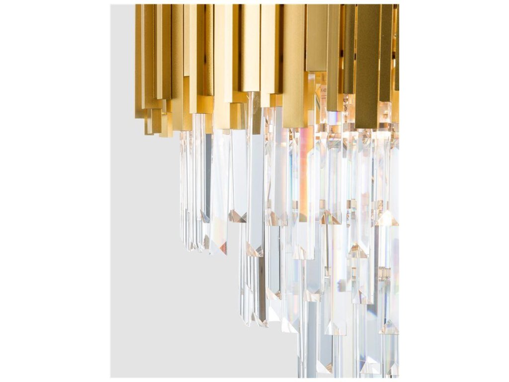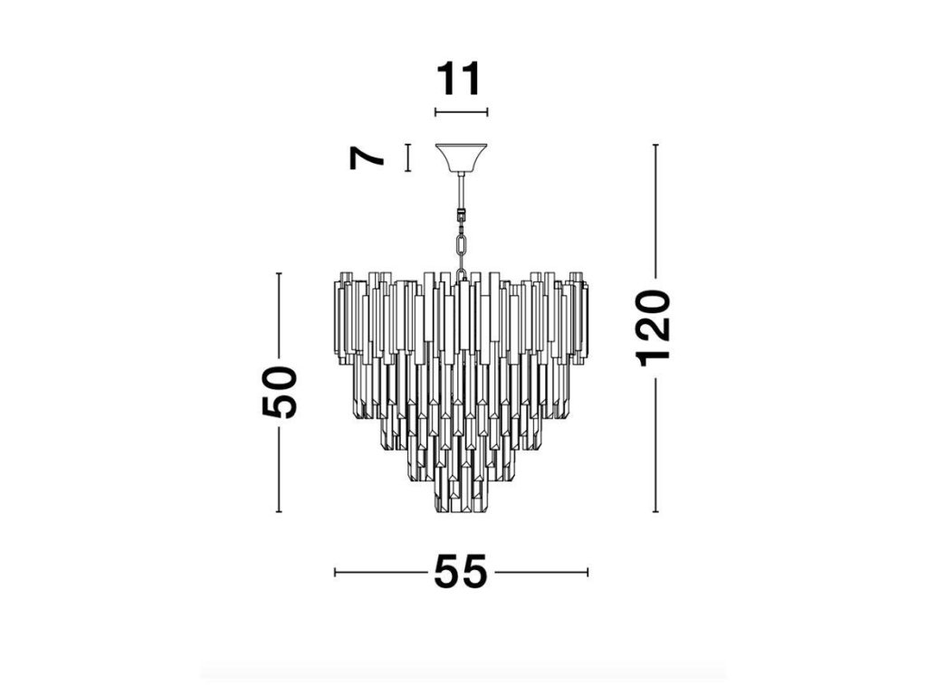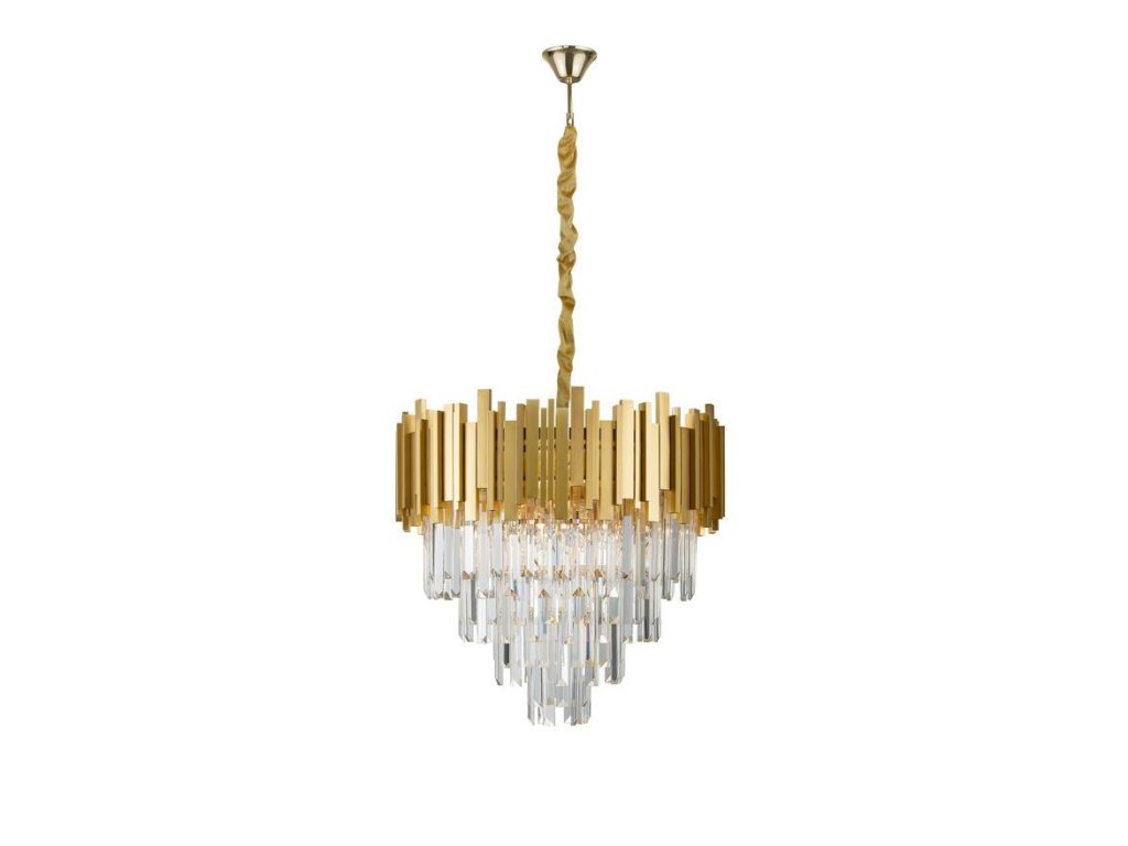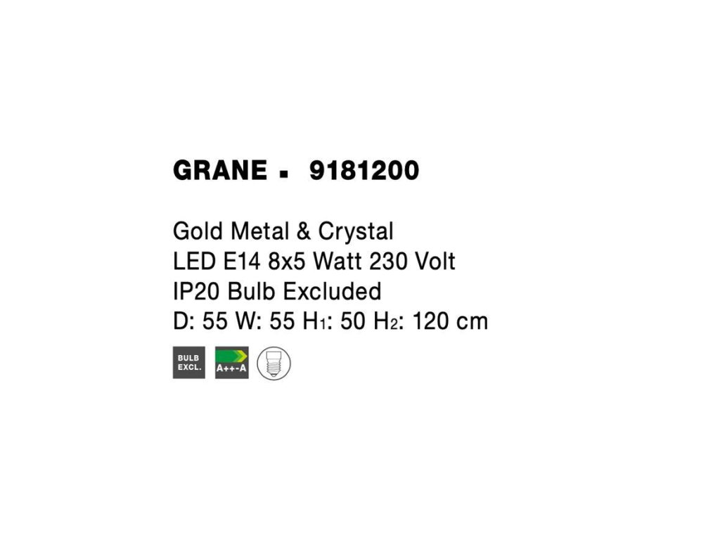 Závesné svietidlo GRANE je k dispozícii v zlatej farbe. Svietidlo je vyrobené z kovu a krištáľu. Rozmery svietidla sú 55x120 cm. Svietidlo odporúčame nad jedálenský stôl, do obývacej izby alebo spálne. Žiarovky E14 nie sú súčasťou balenia.