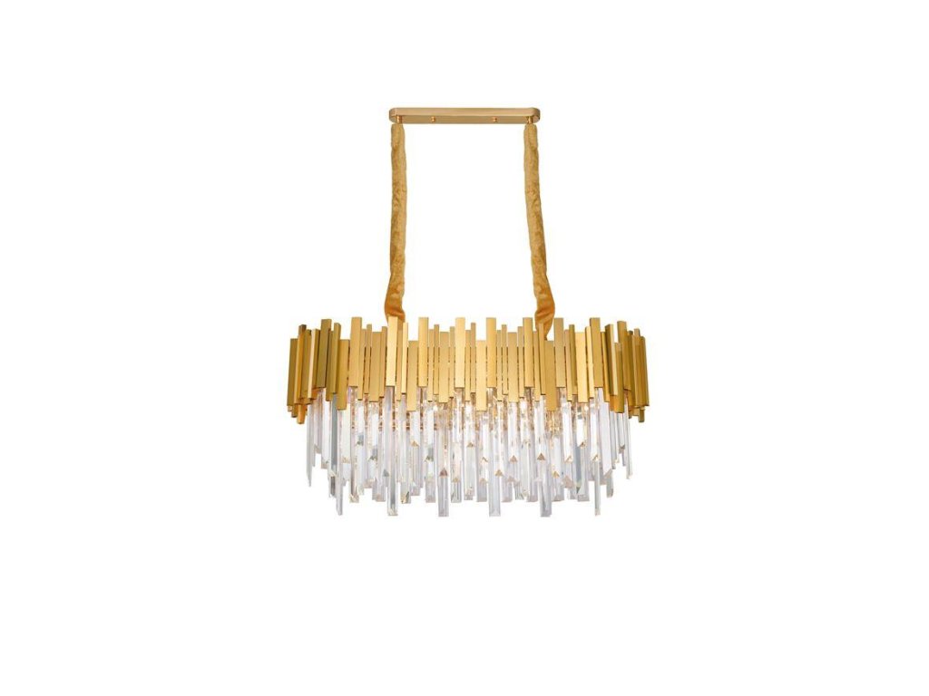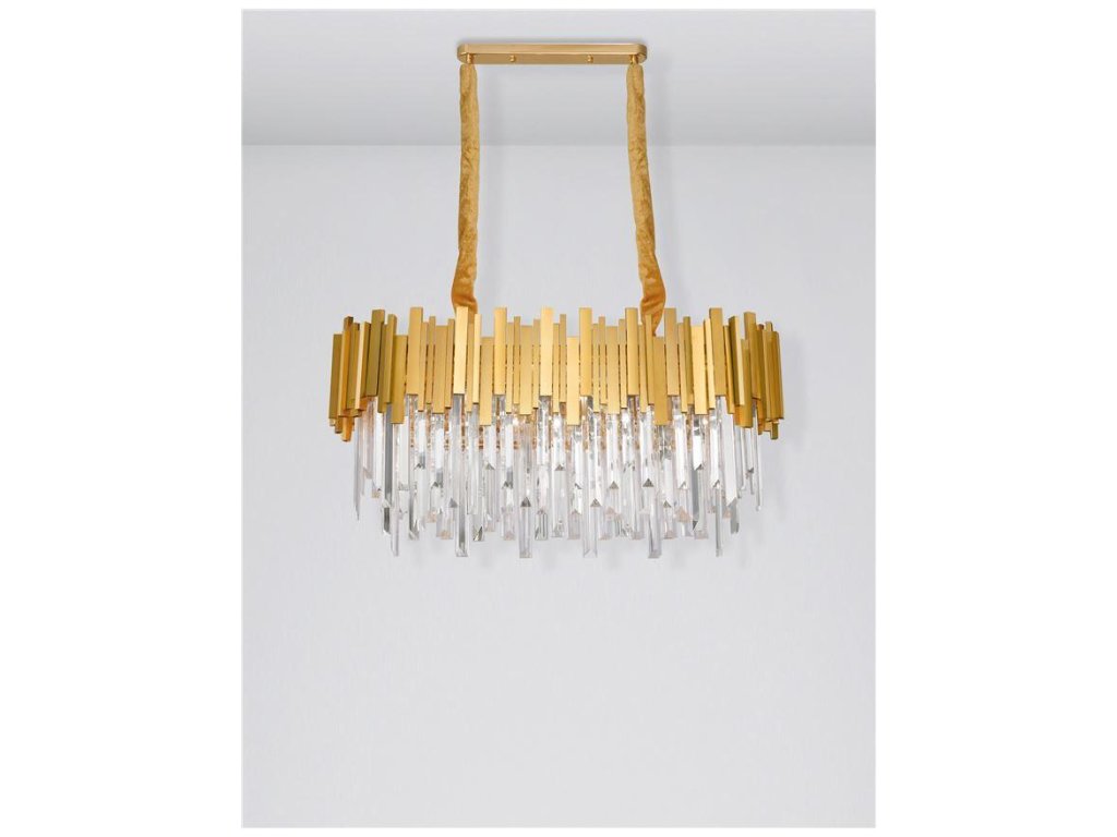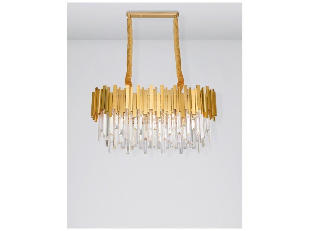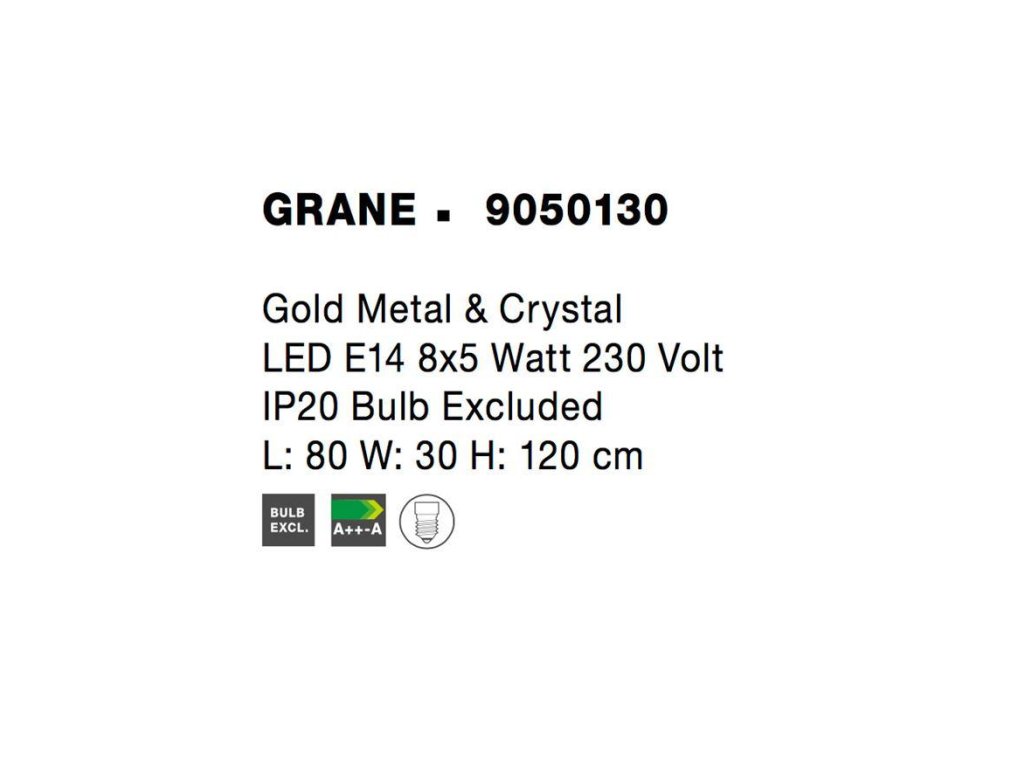 Závesné svietidlo GRANE je k dispozícii v zlatej farbe. Svietidlo je vyrobené z kovu a krištáľu. Rozmery svietidla sú 80x120 cm. Svietidlo odporúčame nad jedálenský stôl, do obývacej izby alebo spálne. Žiarovky E14 nie sú súčasťou balenia.