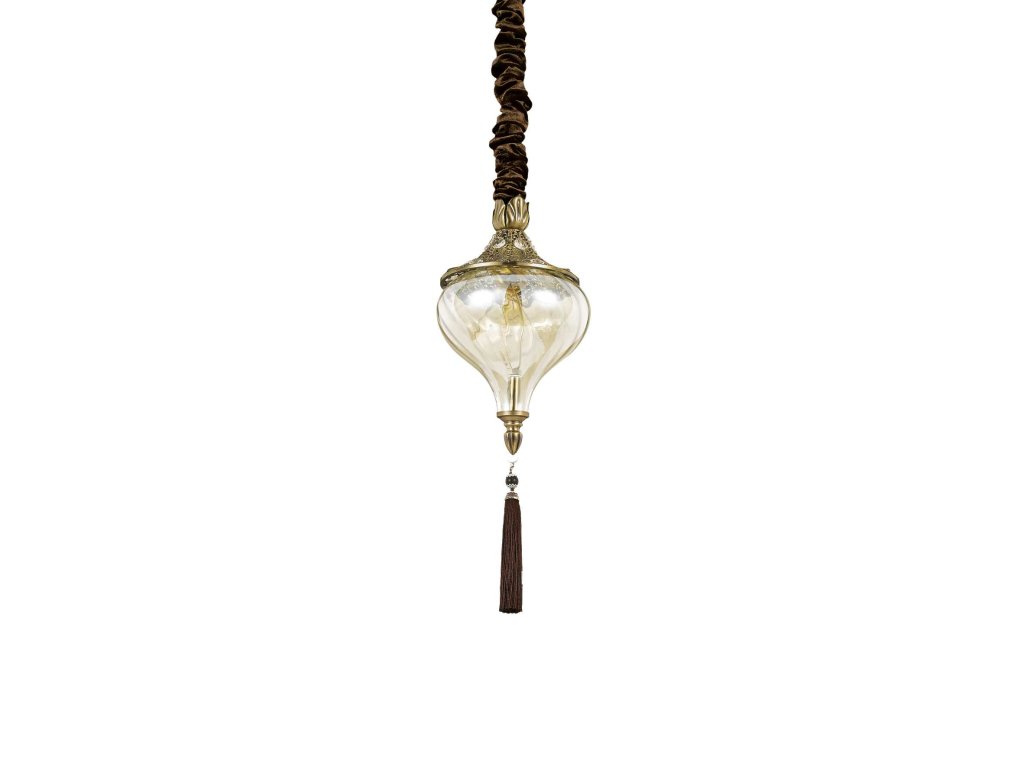Závesné svietidlo Harem z kolekcie rustikálneho osvetlenia značky Ideal Lux sa dokonale hodí do domácností v retro štýle alebo do starých víl či rezidencií. Skvele poslúži ako hlavné osvetlenie v obývacej izbe, spálni či pracovni. Vzhľadom k nízkemu krytiu IP20 je určené iba na vnútorné použitie. Jeho rám je zhotovený z kvalitného kovu v povrchovej úprave starožitnej mosadze, ktorý je zdobený reliéfmi a osadený kryštálmi. Difúzor je vyrobený z fúkaného skla v jantárovej farbe. Svietidlo zdobí prívesok so strapcom a je osadené päticou E27 pre žiarovku s maximálnym príkonom 1 x 60 W. Zdroj nie je súčasťou balenia. Prívodný kábel je pokrytý zamatom a jeho výšku je možné regulovať od 55 cm do 103 cm. Svietidlo je určené na napájanie zo siete na 220-240 V. Celkové rozmery činia 103 x 16,5 x 16,5 cm. Vzťahuje sa naň predĺžená záruka 5 rokov.Dodatočné parametre