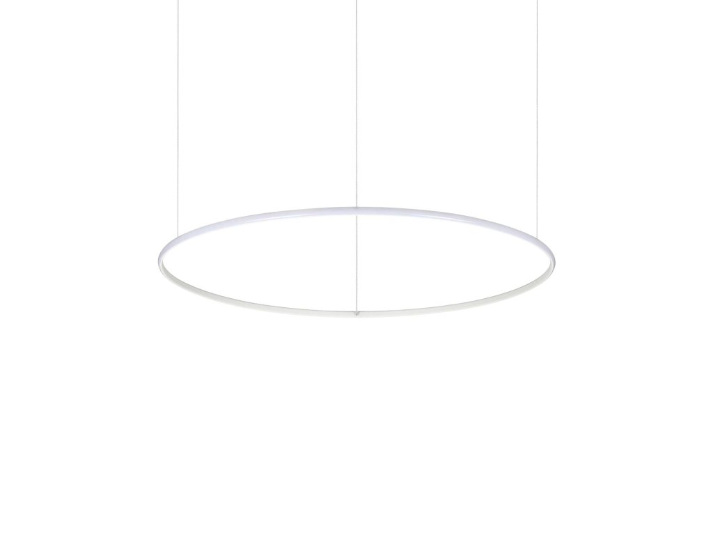 Závesné svietidlo HULAHOOP z kolekcie dizajnového osvetlenia značky Ideal Lux v najväčšej verzii s priemerom 100,5 cm skvele osvieti každý moderne zariadený interiér. Je ideálnym osvetlením jedálenského kúta, kuchyne či obývacej izby, ale aj kancelárií, rokovacích a zasadacích miestností. Vzhľadom na nízke krytie IP20 nie je vhodné do miest s výskytom vyššej vlhkosti vzduchu. Hranatá základňa a kruhový rám svietidla s výškou iba 2 cm je vyrobená z kvalitného kovu s bielou povrchovou úpravou nanášanou metódou práškovania. Vnútri rámu sa nachádza gumový difúzor v opálovej farbe s integrovaným LED zdroj s príkonom 1 x 50 W so svietivosťou až 5000lm a teplotou chromatickosti 3000K (neutrálna žltá farba). Intenzitu nie je možné stmievať. Svietidlo je k stropu upevnené pomocou stropných podpier a železných laniek, ktorých dĺžku je možné regulovať od 17 do 212 cm. Zo základne vedie číry plastový prívodný kábel. Je určené na napájanie zo siete na 220-240 V. Celkové rozmery svietidla činia 212 x 100,5 x 100,5 cm. Životnosť zdroja dosahuje 17 500 hodín. Na svietidlo sa vzťahuje záruka 3 roky.Dodatočné parametre
