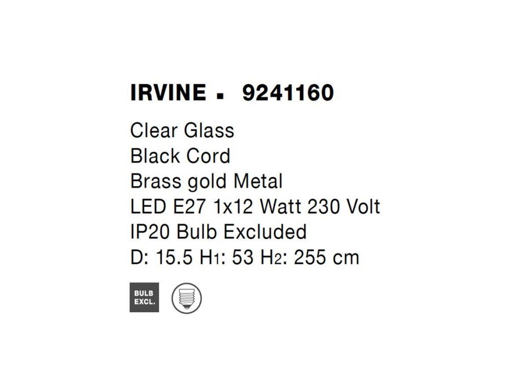 Závesné svietidlo IRVINE je k dispozícii v zlato-čiernom prevedení. Svietidlo je vyrobené z kovu, lana a skla. Rozmery svietidla sú 15,5x255 cm. Výška tienidla z číreho skla je 53 cm. Svietidlo odporúčame do spálne alebo obývačky. Žiarovka E27 nie je súčasťou balenia.