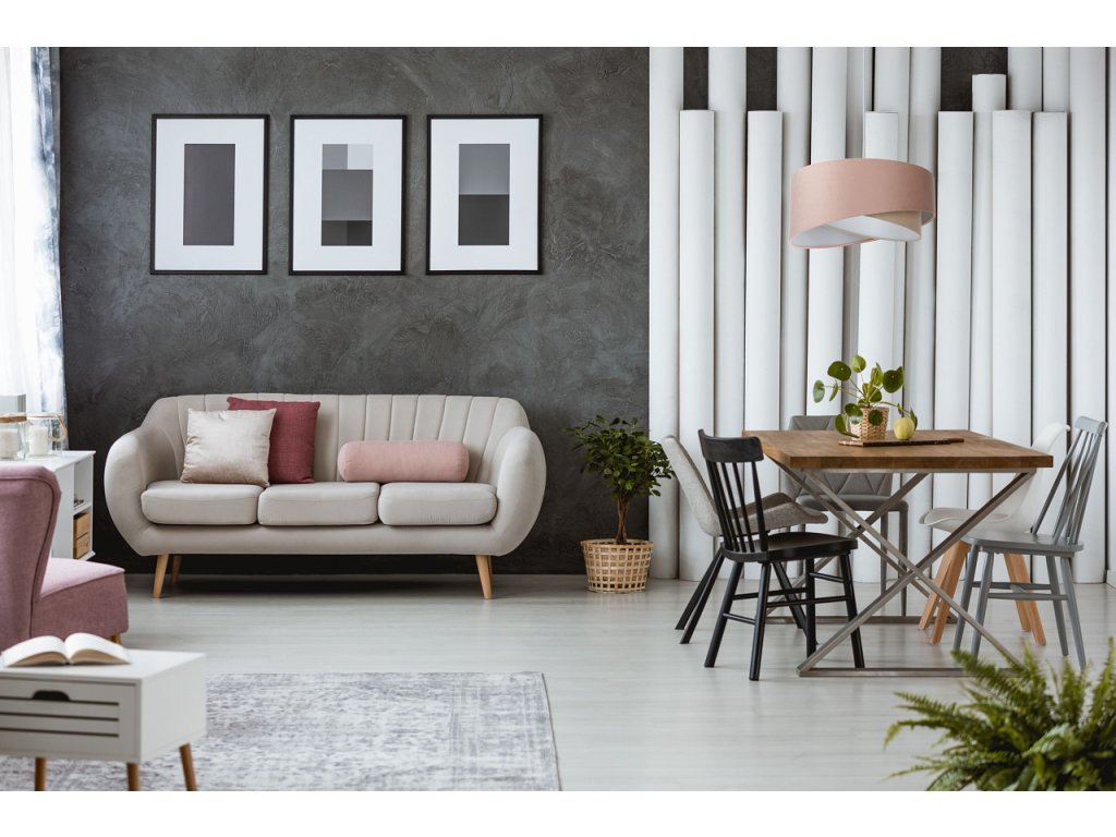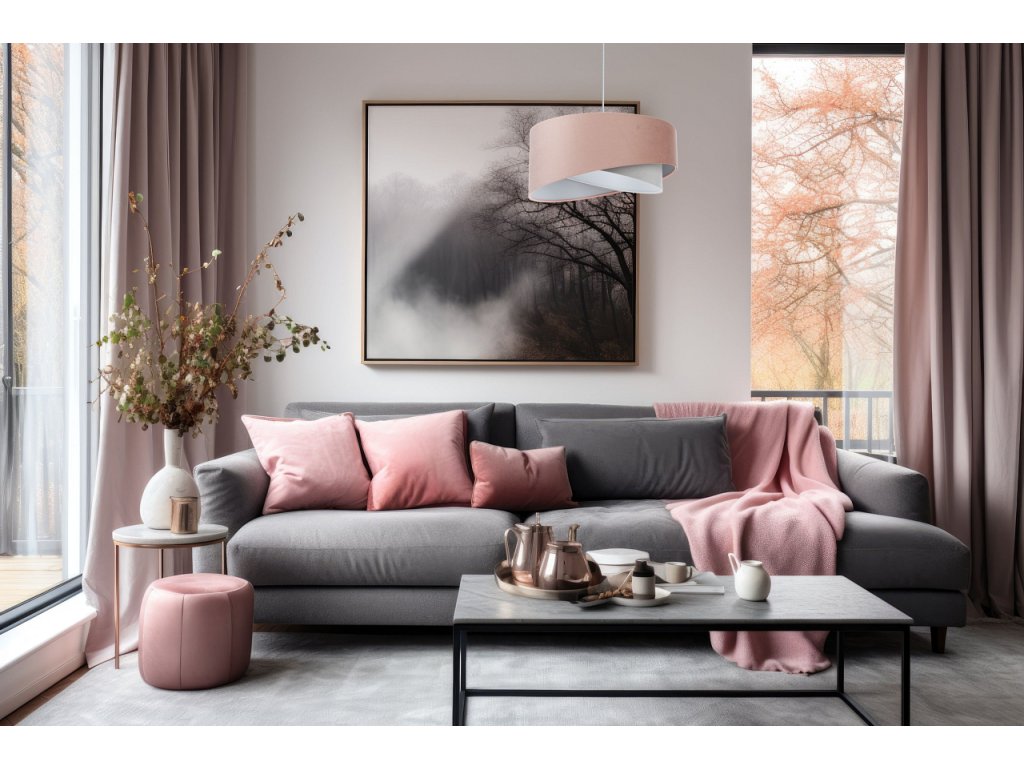 Závesné svietidlo JASMIN v ružovej farbe v kombinácii s tromi farebnými variantmi - šedá, béžová a ružová. Tienidlo je odolné voči UV žiareniu, takže tkanina počas používania nevybledne. Priemer svietidla je 45 cm. Skvele sa hodí do obývacej izby či spálne.