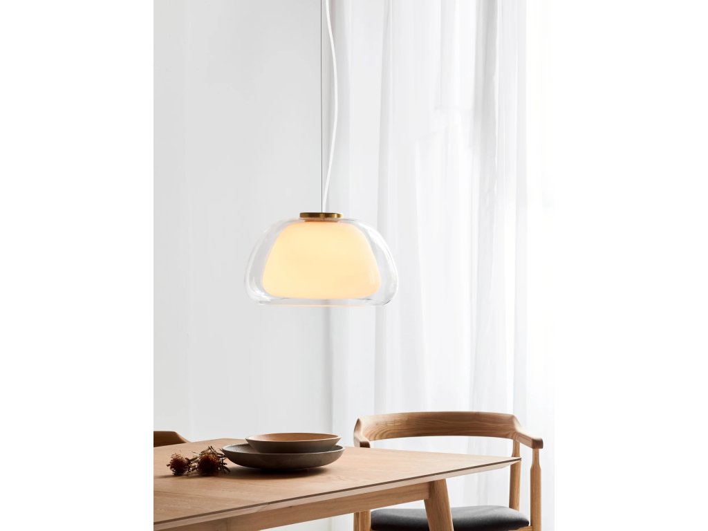 Závesné svietidlo Jelly sa skladá z dvoch vrstiev skla, pričom vnútorné tienidlo je z bieleho opálového skla a vonkajšie tienidlo z číreho skla, ktoré dodáva svetlu mäkkú a teplú žiaru.