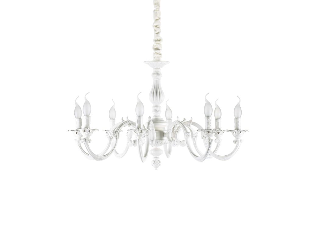 Jedinečný závesný luster JUSTINE SP8 z kolekcie interiérového osvetlenia Ideal Lux vo väčšom prevedení s priemerom 79 cm vhodný na nasvietenie obývacej izby, spálne a haly alebo hotelových interiérov v modernom aj klasickom štýle. Na výrobu svietidla bol použitý kov s matnou bielou povrchovou úpravou doplnenou o dekoratívne ornamenty. Závesná reťaz je potiahnutá bielym zamatom a dĺžku jej zavesenia je možné flexibilne nastaviť pri inštalácii podľa potreby od 62 cm do 154 cm. Každé rameno lustra je osadené päticou E14 s maximálnym príkonom 8 x 40 W. Žiarovky nie sú súčasťou balenia. Odporúčame použiť úsporné LED svetelné zdroje v tvare kvapky (typ banky B) alebo sviečky (typ banky BA). Krytie IP20 vyjadruje vhodnosť na použitie do interiéru.Dodatočné parametre