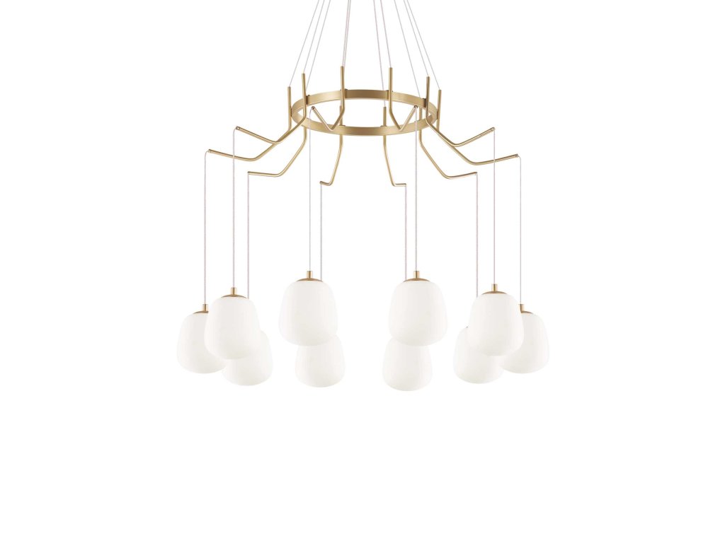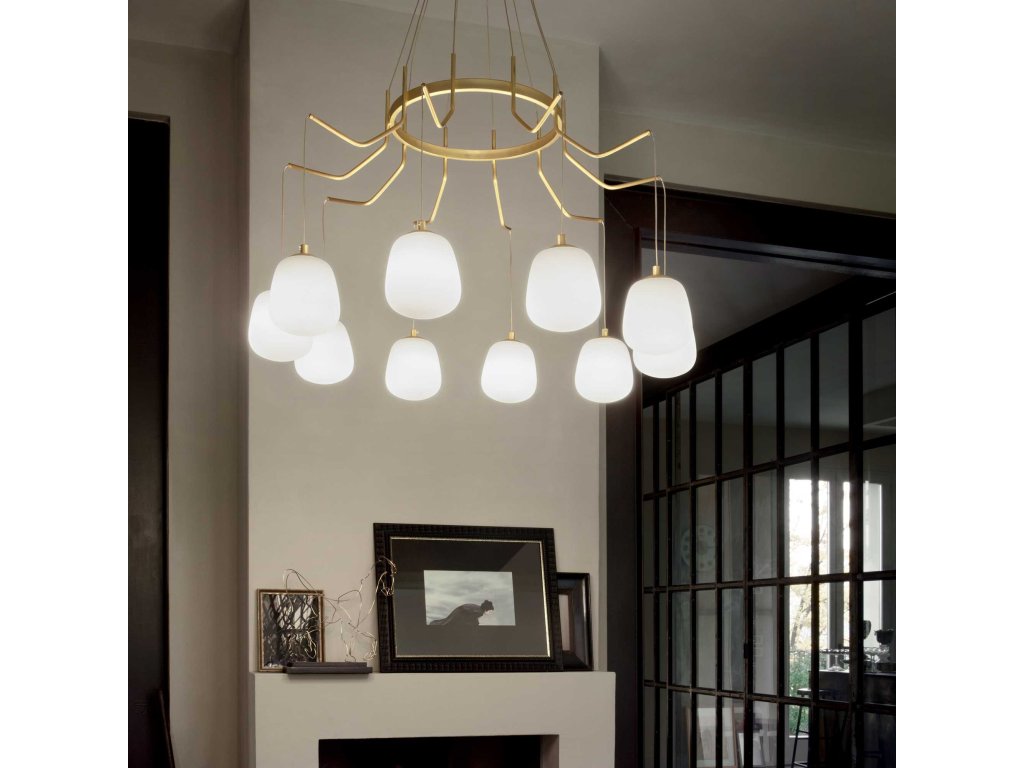 Zaujímavý závesný luster KAROUSEL SP10 z kolekcie dizajnového osvetlenia Ideal Lux vo väčšom prevedení s priemerom 82,5 cm ideálny na nasvietenie obývacieho priestoru, haly, jedálne v moderne aj klasicky ladenom interiéri. Originálne tvarované svietidlo je vyrobené z kovu s mosadznou povrchovou úpravou. Fúkané tienidlá z bieleho leptaného skla skrývajú pätice G9 s maximálnym príkonom 10 x 15 W. Súčasťou balenia sú úsporné LED svetelné zdroje s príkonom 10 x 3,2 W a teplotou chromatickosti 3000K. Dĺžku zavesenia oceľových laniek je možné ľubovoľne nastaviť pri inštalácii podľa potreby od 112 cm do 133 cm. Krytie IP20 označuje vhodnosť na použitie do interiéru.Dodatočné parametre