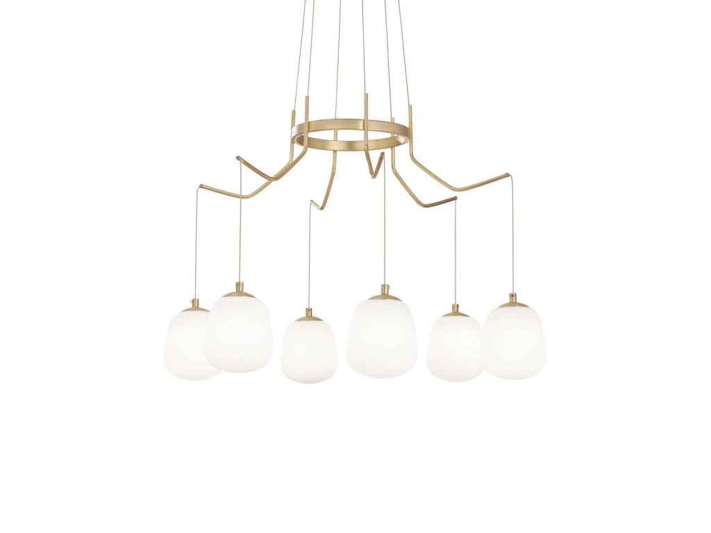 Zaujímavý závesný luster KAROUSEL SP6 z kolekcie dizajnového osvetlenia Ideal Lux v menšom prevedení s priemerom 72 cm ideálny na nasvietenie obývacieho priestoru, haly, jedálne v moderne aj klasicky ladenom interiéri. Originálne tvarované svietidlo je vyrobené z kovu s mosadznou povrchovou úpravou. Fúkané tienidlá z bieleho leptaného skla skrývajú pätice G9 s maximálnym príkonom 6 x 15 W. Súčasťou balenia sú úsporné LED svetelné zdroje s príkonom 6 x 3,2 W a teplotou chromatickosti 3000K. Dĺžku zavesenia oceľových laniek je možné ľubovoľne nastaviť pri inštalácii podľa potreby od 97,5 cm do 127 cm. Krytie IP20 označuje vhodnosť na použitie do interiéru.Dodatočné parametre