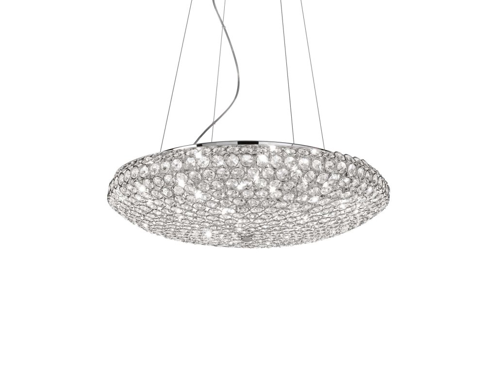 Závesné svietidlo King z kolekcie interiérového osvetlenia značky Ideal Lux v modernom prevedení a priemerom 65 cm má zaujímavo riešený dizajn, ktorý zaujme každú návštevu. Základňa s priemerom 22 cm a rám svietidla sú zhotovené z kvalitného kovu s lesklo chrómovou povrchovou úpravou. Dominantou svietidla je difúzor zložený z chrómových kovových krúžkov, ktoré sú vyplnené osemhrannými krištáľmi. Svietidlo je osadené päticami G9 pre žiarovky s maximálnym príkonom 12 x 40 W. Súčasťou balenia sú LED G9 žiarovky s príkonom 12 x 3 W so svietivosťou 12 x 370 lm a teplotou chromatickosti 3000 K. Krytie IP20 je vhodné pre vnútornú inštaláciu. Celkové rozmery svietidla sú 120 x 65 x 65 cm. Výšku oceľových laniek je možné regulovať od 40 cm do 120 cm. Je určené na napájanie zo siete na 220-240 VDodatočné parametre