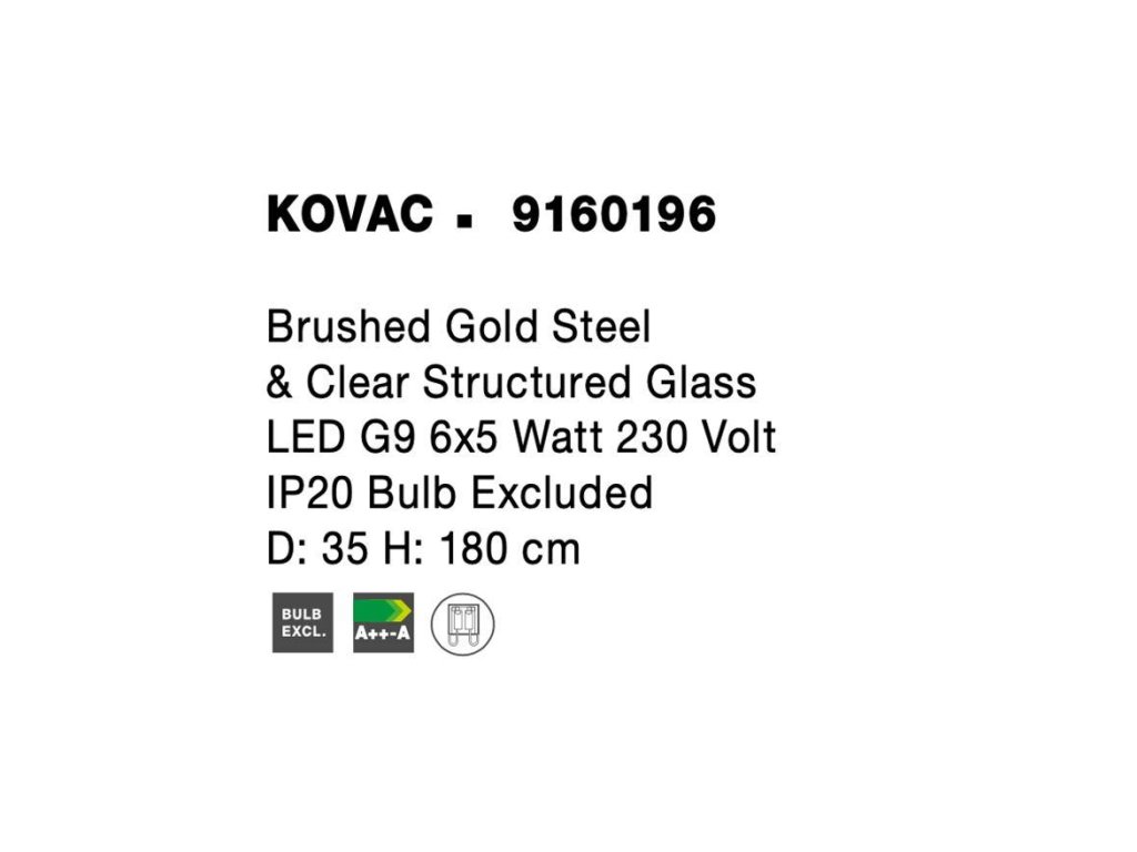 Závesné svietidlo KOVAC je k dispozícii v zlatej farbe. Svietidlo je vyrobené z kovu a skla. Rozmery svietidla sú 35x180 cm. Výška skleneného tienidla je 29 cm. Svietidlo odporúčame nad jedálenský stôl, do obývacej izby alebo do spálne. Žiarovky G9 nie sú súčasťou balenia.Dodatočné parametre