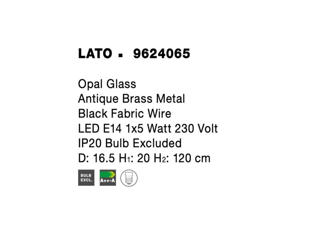 Závesné svietidlo LATO je k dispozícii v zlatej farbe s čiernym látkovým drôtom a skleneným tienidlom. Svietidlo je vyrobené z kovu a skla. Rozmery svietidla sú 16,5x120 cm. Výška skleneného tienidla je 20 cm. Svietidlo odporúčame do obývacej izby alebo spálne. Žiarovka E14 nie je súčasťou balenia.Dodatočné parametre