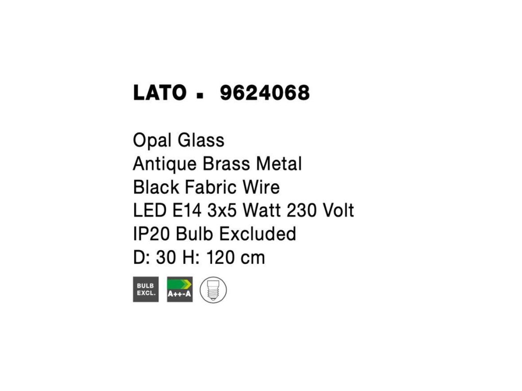Závesné svietidlo LATO je k dispozícii v zlatej farbe s čiernym látkovým drôtom a sklenenými tienidlami. Svietidlo je vyrobené z kovu a skla. Rozmery svietidla sú 30x120 cm. Svietidlo odporúčame nad jedálenský stôl, do obývacej izby alebo spálne. Žiarovky E14 nie sú súčasťou balenia.Dodatočné parametre