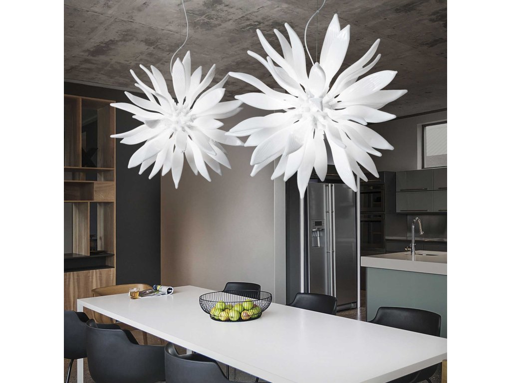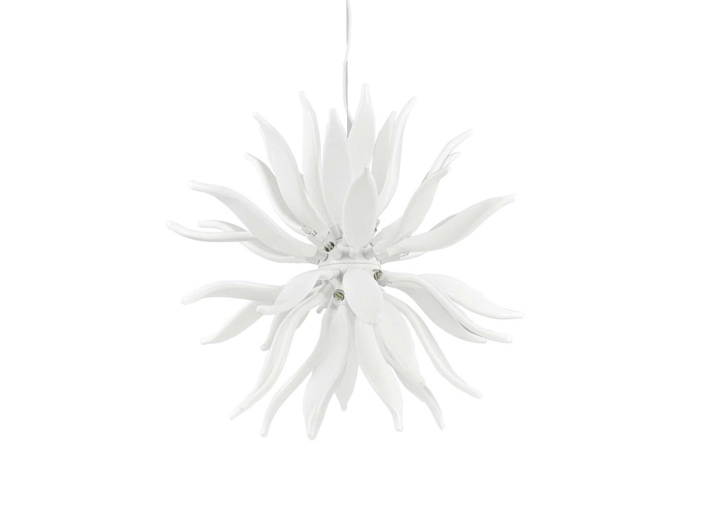 Závesný luster Leaves značky Ideal Lux v luxusnom prevedení s priemerom 80 cm ponúkne ideálne osvetlenie obývacej izby, kuchyne či jedálne. Rám svetla je zhotovená z kvalitného kovu s bielou povrchovou úpravou. Dominantou svietidla je úchvatné tienidlo zložené z ručne tvarovaných bielych elementov v tvare listov z bieleho fúkaného skla. Výšku zavesenia lustra je možné flexibilne nastaviť podľa potreby pri inštalácii svietidla od 79 cm do 288 cm. Svietidlo je osadené päticami G9 pre žiarovky s maximálnym príkonom 12 x 40 W. Súčasťou balenia sú LED G9 žiarovky s príkonom 12 x 3 W so svietivosťou 12 x 370 lm a teplotou chromatickosti 3000 K. Krytie IP20 je vhodné pre použitie do interiéru. Celkové rozmery svietidla sú 288 x 80 x 80 cm. Je určené na napájanie zo siete na 220-240 V.Dodatočné parametre