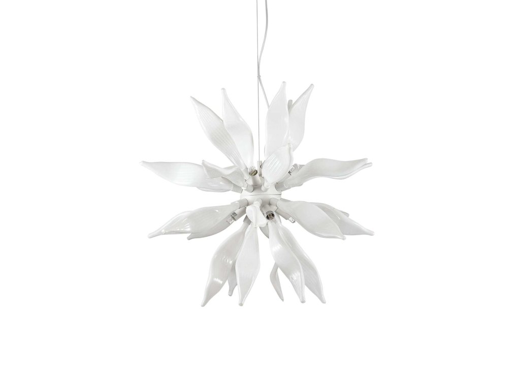 Závesný luster Leaves značky Ideal Lux v luxusnom prevedení s priemerom 63 cm ponúkne ideálne osvetlenie obývacej izby, kuchyne či jedálne. Rám svetla je zhotovená z kvalitného kovu s bielou povrchovou úpravou. Dominantou svietidla je úchvatné tienidlo zložené z ručne tvarovaných bielych elementov v tvare listov z bieleho fúkaného skla. Výšku zavesenia lustra je možné flexibilne nastaviť podľa potreby pri inštalácii svietidla od 69,5 cm do 278,5 cm. Svietidlo je osadené päticami G9 pre žiarovky s maximálnym príkonom 8 x 40 W. Súčasťou balenia sú LED G9 žiarovky s príkonom 8 x 3 W so svietivosťou 8 x 370 lm a teplotou chromatickosti 3000 K. Krytie IP20 je vhodné na použitie do interiéru. Celkové rozmery svietidla sú 278,5 x 63 x 63 cm. Je určené na napájanie zo siete na 220-240 V.Dodatočné parametre
