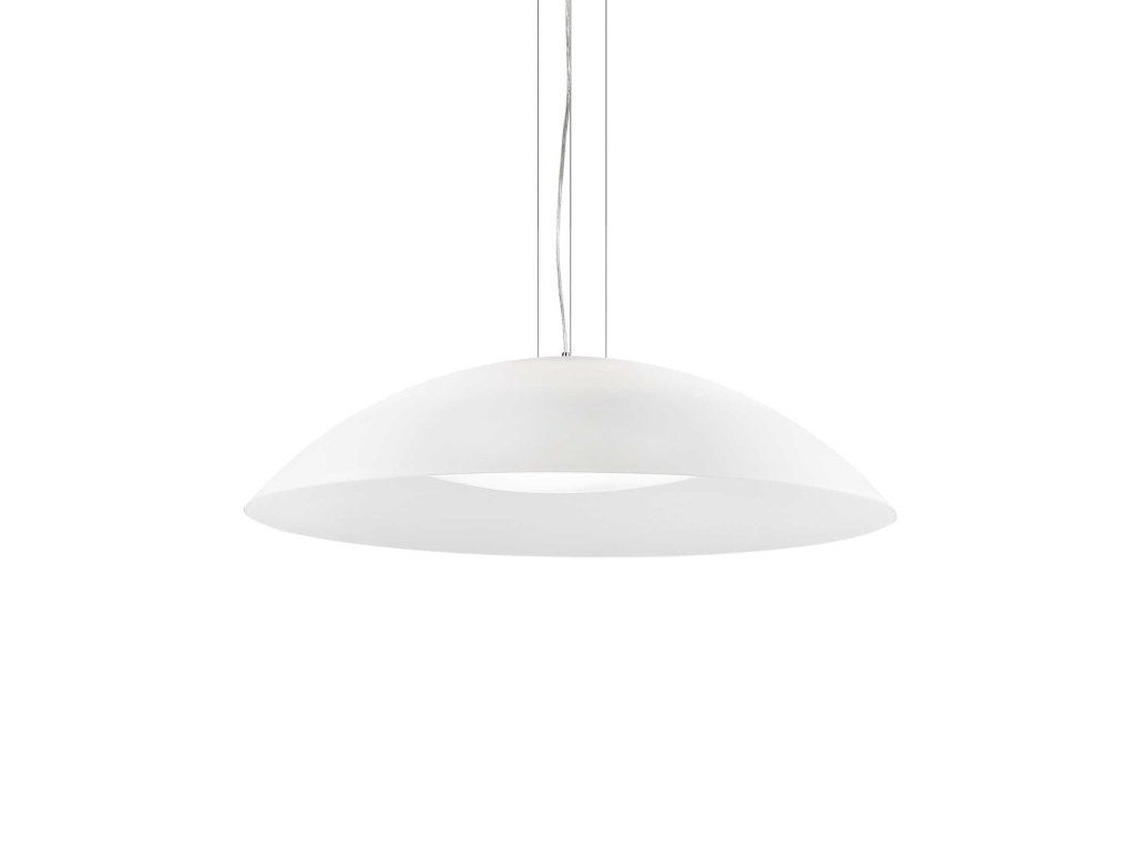 Závesné svietidlo Lena z kolekcie moderného osvetlenia značky Ideal Lux vo väčšom prevedení s priemerom 74 cm je ideálnou voľbou na osvietenie obývacej izby, jedálne či kuchyne. Skvele sa bude vynímať nad jedálenským stolom. Guľatá základňa s priemerom 11 cm je zhotovená z kvalitného kovu s chrómovou povrchovou úpravou. Okrúhly difúzor s výškou 19 cm je vyrobený z dvojitého skla v bielej farbe. Vonkajšie sklo je matné a vnútorné je čisto biele. Je osadené päticami E27 pre žiarovky s maximálnym príkonom 3 x 60 W. Zdroje nie sú súčasťou balenia. Odporúčame zvoliť LED žiarovky na úsporu elektrickej energie. Krytie IP20 je vhodné pre vnútornú inštaláciu. Celkové rozmery svietidla sú 234 x 74 x 74 cm. Výšku závesu je možné nastaviť od 25 cm do 234 cm. Oceľové lanká disponujú automatickým brzdením. Svietidlo je určené na napájanie zo siete na 220-240 V.Dodatočné parametre