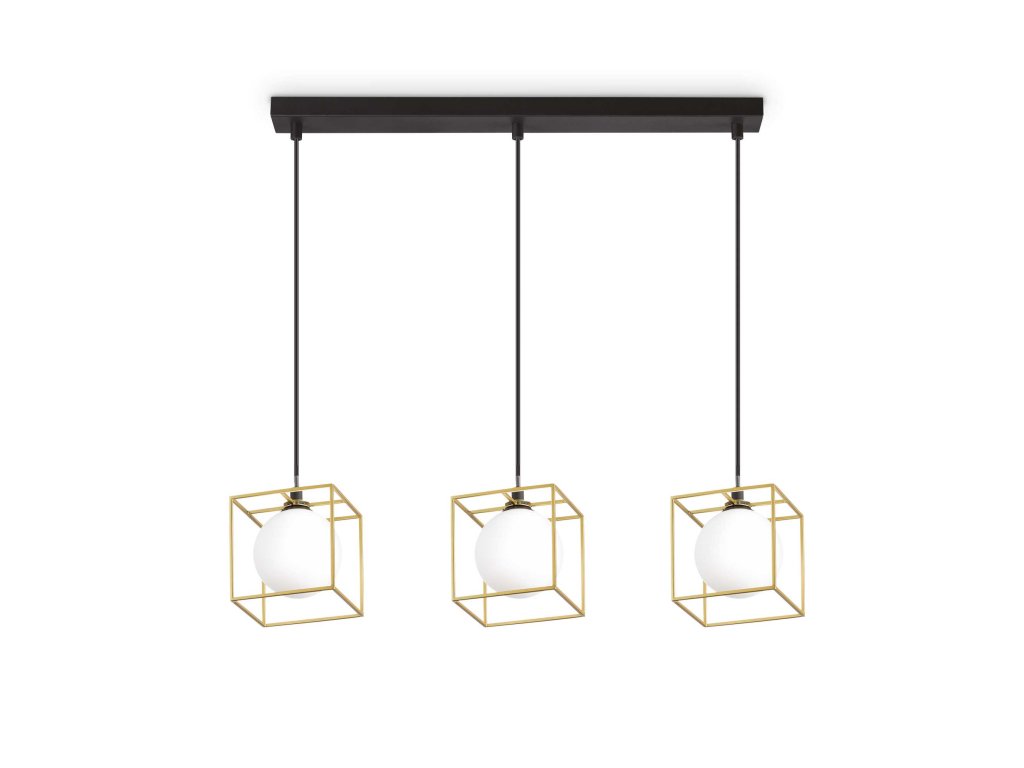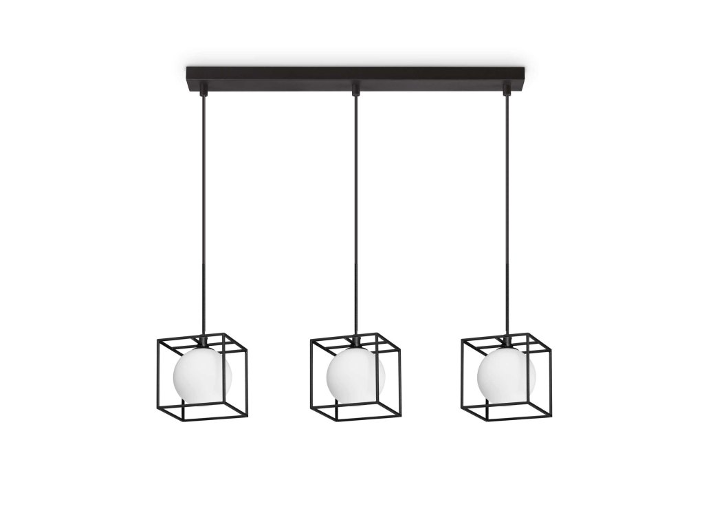 - originálny závesný luster tvorí lakovaná kovová stropná základňa o rozmeroch 60 x 6 cm s čiernou povrchovou úpravou a kovovou konštrukciou zloženou z jednej strany troch kociek. 12 cm, vo vnútri ktorej sú umiestnené okrúhle difúzory z fúkaného leptaného bieleho skla