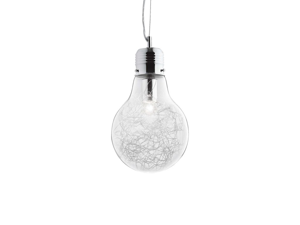 Závesné svietidlo Luce Max z kolekcie dizajnového osvetlenia značky Ideal Lux v modernom prevedení s priemerom 22 cm je ideálnou voľbou na osvietenie obývacej izby, jedálne či kuchyne. Vďaka svojmu zaujímavému designu a difúzorom v tvare žiarovky skvele zapadne do holetových a reštauračných interiérov. Jeho základňa s priemerom 9 cm a rám sú zhotovené z kvalitného kovu s chrómovou povrchovou úpravou. Mohutný difúzor je vyrobený z číreho fúkaného skla, ktorého vnútorná časť je zdobená prepletenými hliníkovými vláknami. Je osadený päticami E27 pre žiarovku s maximálnym príkonom 1 x 60 W. Zdroj nie je súčasťou balenia. Odporúčame zvoliť LED filamentovú žiarovku na úsporu elektrickej energie a dokonalý svetelný efekt. Krytie IP20 je vhodné pre vnútornú inštaláciu. Celkové rozmery svietidla sú 254 x 22 x 22 cm. Výšku závesu je možné nastaviť od 45 cm do 254 cm. Svietidlo je určené na napájanie zo siete na 220-240 V.Dodatočné parametre