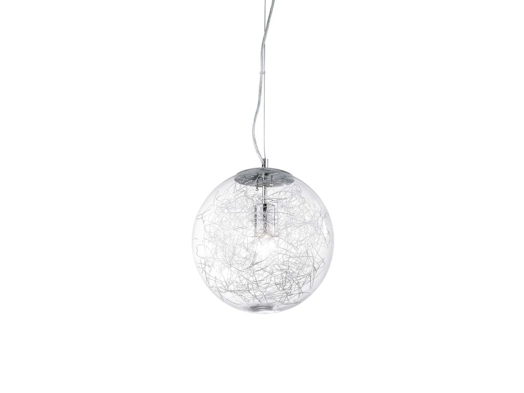 Závesné svietidlo Mapa Max z kolekcie moderného osvetlenia značky Ideal Lux sa dokonale hodí do každého interiéru a dodá dostatok svetla v obývacej izbe, kuchyni či jedálni. Prekvapí vás jeho zaujímavo riešený difúzor. Vzhľadom k nízkemu krytiu IP20 je určené iba na vnútorné použitie. Je zhotovené z kvalitných materiálov. Kovová základňa v chrómovej farbe je doplnená o okrúhly difúzor z číreho fúkaného skla, ktorého vnútorná časť je zdobená sieťou dekoratívnych hliníkových vlákien. Je osadené päticou E27 pre žiarovku s maximálnym príkonom 1 x 60 W. Luster je určený na napájanie zo siete na 220-240 V. Výšku prívodného kábla je možné regulovať od 36 cm do 245 cm. Oceľové lanká sú vybavené systémom automatického zablokovania. Celkové rozmery sú 245 x 30 x 30 cm.Dodatočné parametre