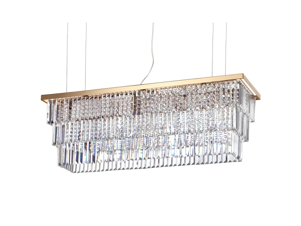 Monumentálny blyštivý závesný luster MARTINEZ SP8 v tvare obdĺžnika s dĺžkou 103 cm vhodný na nasvietenie klasických, ale aj moderných priestorov alebo hotelových interiérov. Kovový rám s chrómovou alebo mosadznou povrchovou úpravou tvorí dekoratívne retiazky usporiadané do osemuholníkov a podlhovasté ovesky z brúseného krištáľu. Dĺžku zavesenia je možné flexibilne nastaviť podľa potreby pri inštalácii lustra od 70 cm do 132 cm. Svietidlo je osadené päticami E14 s maximálnym príkonom 8 x 40 W. Žiarovky nie sú súčasťou balenia. Odporúčame zvoliť LED žiarovky, ktoré majú dlhú životnosť a zároveň šetria elektrickú energiu. Krytie IP20 je vhodné na použitie do interiéru.