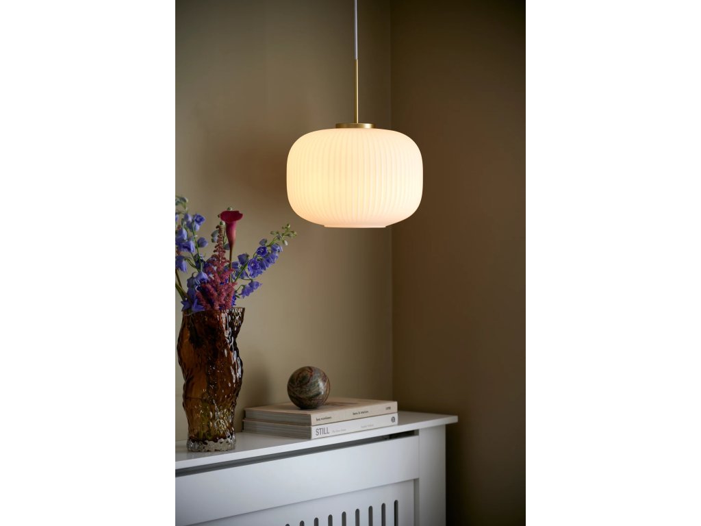 Milford je dekoratívne závesné svietidlo, ktoré sa vyznačuje charakteristickým pretiahnutým tienidlom s plisovanou štruktúrou. Tienidlo je vyrobené z ručne fúkaného opálovo bieleho skla, a preto po rozsvietení vydáva svietidlo obzvlášť príjemné, rozptýlené a neoslňujúce svetlo.