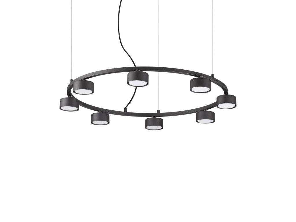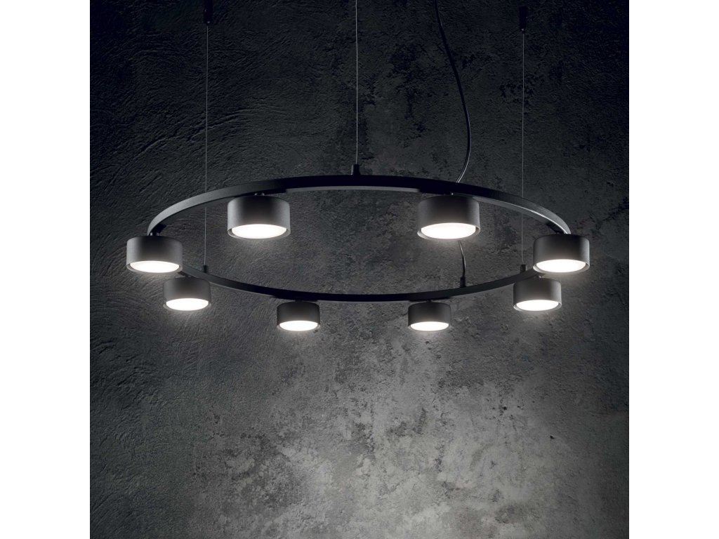 Závesné svietidlo Minor Round SP8 z kolekcie interiérového osvetlenia talianskej značky Ideal Lux vo väčšej kruhovej verzii o celkovom priemere 76,5 cm vynikne svojim kvalitným spracovaním v každej moderne zariadenej obývacej izbe, jedálenskom kúte či pracovni. Rovnako sa svojim dizajnom hodí do kancelárií, rokovacích a zasadacích miestností veľkých obchodných korporácií. Jeho okrúhla základňa s priemerom 9 cm a tenký rám vysoký 4 cm s ôsmimi okrúhlymi difúzormi s priemerom 8,5 cm sú vyrobené z kvalitného kovu s matne čiernou povrchovou úpravou nanášanou metódou práškovania. Plastový prívodný kábel čiernej farby je možné výškovo nastaviť od 10 cm do 219 cm dĺžky. Z rámu vedú tri závesné lanká na uchytenie k stropu. Svietidlo je osadené päticou GX53 s maximálnym príkonom 8 x 15 W. Súčasťou balenia sú LED žiarovky (obj. kód 101385) s príkonom 7W, svietivosťou 560lm a teplotou chromatickosti 3000K (neutrálne žlté svetlo). Ich výhodou je nízka spotreba elektrickej energie a dlhá doba životnosti až 25 000 hodín. Krytie IP20 je určené na vnútornú montáž do miest bez väčšej vlhkosti vzduchu.Dodatočné parametre