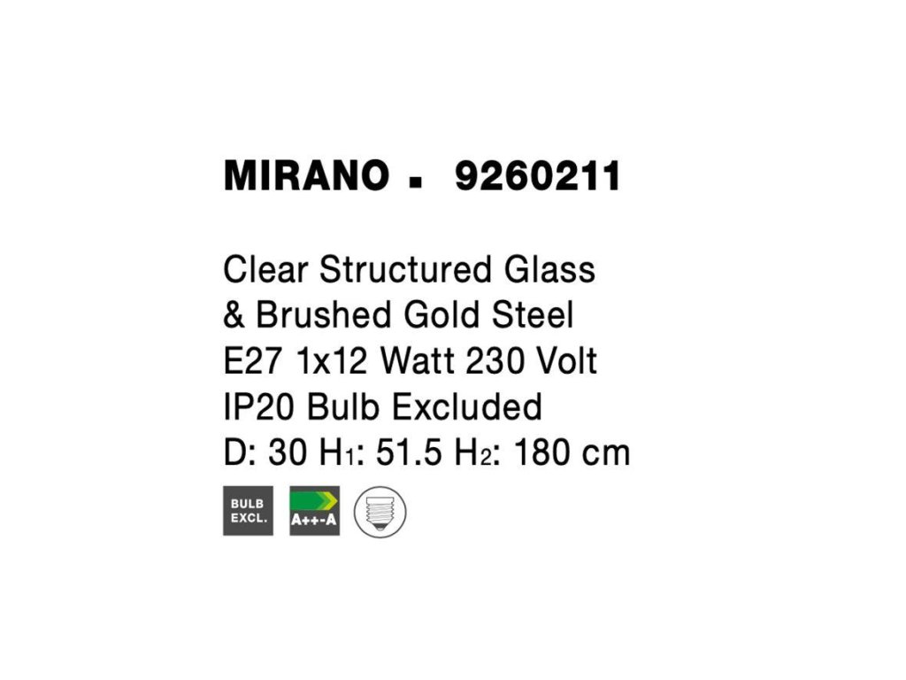 Závesné svietidlo MIRANO je k dispozícii v zlatej farbe. Svietidlo je vyrobené z ocele a skla. Rozmery svietidla sú 30x180 cm. Výška skleneného tienidla je 51,5 cm. Svietidlo odporúčame do obývacej izby alebo do spálne. Žiarovka E27 nie je súčasťou balenia.Dodatočné parametre