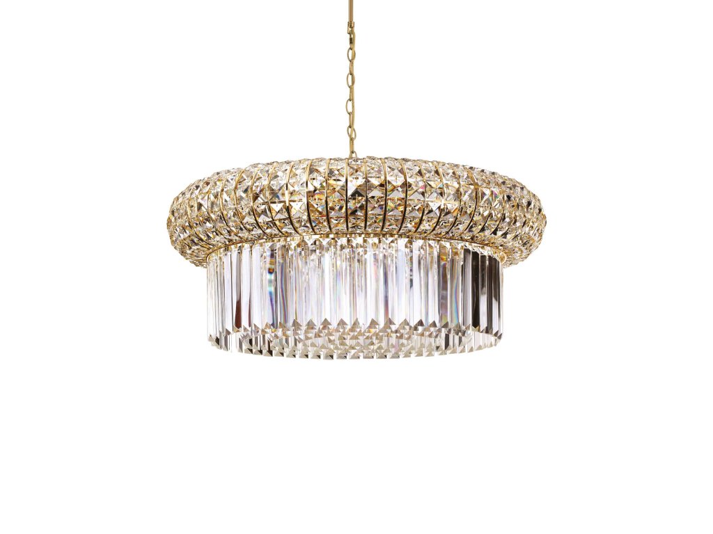 Závesný luster Nabucco SP16 z kolekcie interiérového osvetlenia talianskeho výrobcu značky Ideal Lux vo väčšom prevedení o celkovom priemere 70 cm zaujme svojim mohutným rustikálnym dizajnom, ktorý vynikne vo veľkých miestnostiach, a stane sa tak hlavným stredom Vašej pozornosti. Jeho okrúhla zdobená základňa s priemerom 11 cm a kruhový rám svietidla sú vyrobené z kvalitného kovu so zlatou povrchovou úpravou. Celé svietidlo je zdobené čírymi brúsenými kryštálmi, v hornej časti difúzora majú štvorcový tvar av jeho dolnej časti sú zavesené v tvare podlhovastých diamantov v 5 kruhoch. Luster je osadený päticou E14 o maximálnom príkone 18 x 40 W. Zdroje nie sú súčasťou balenia, dodávateľ odporúča použiť LED filamentové žiarovky (obj. kód 101200) s príkonom 4W, svietivosťou 430lm a teplotou chromatickosti 3000K (neutrálna žltá 0) hodín a nízka spotreba elektrickej energie. Krytie IP20 je určené pre vnútornú montáž. Výšku svietidla je možné nastaviť od 39 cm do 144 cm dĺžky.Dodatočné parametre
