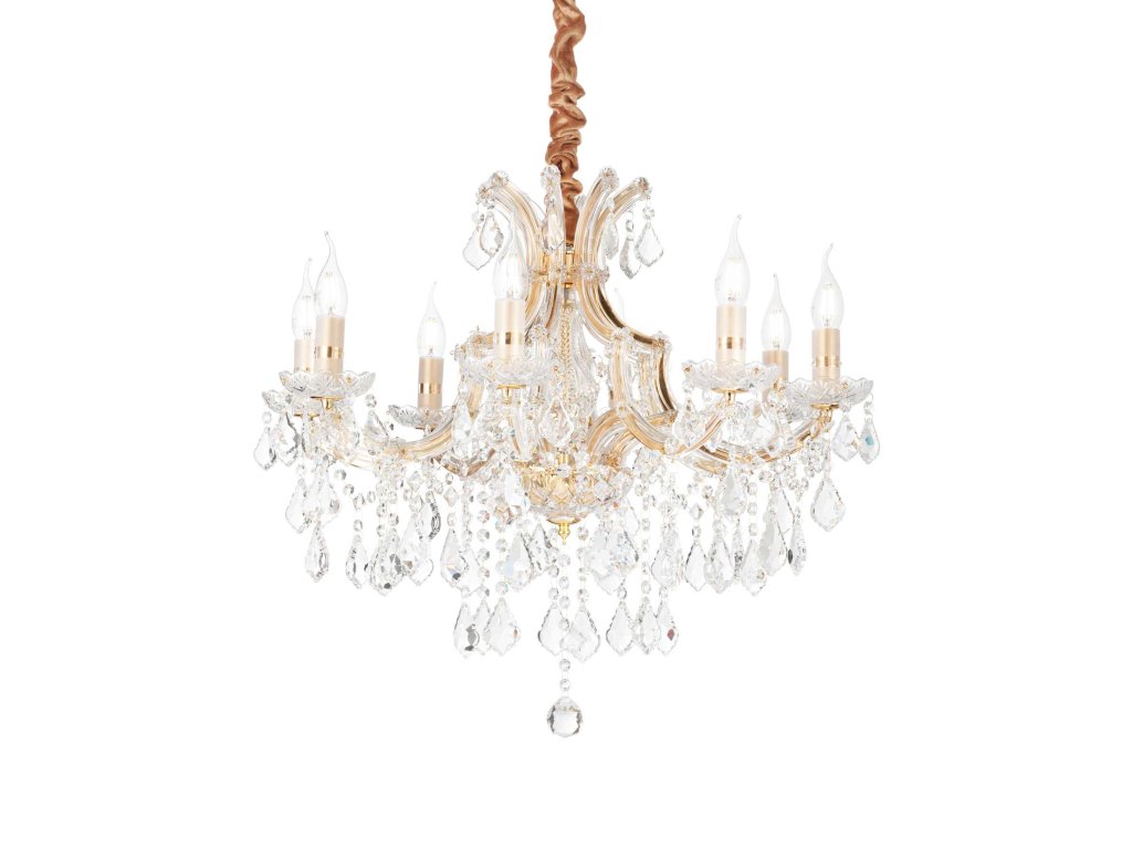 Elegantný krištáľový závesný luster z kolekcie dizajnového osvetlenia Ideal Lux s priemerom 67 cm v zlatom prevedení sa stane dominantou v akomkoľvek interiéri s vysokým stropom. Vhodný na nasvietenie obývacích priestorov, haly alebo hotelových interiérov. Kovový rám so zlatou povrchovou úpravou spolu s ramenami z fúkaného skla je zdobený oveskami a retiazkami z brúseného krištáľu. Závesná reťaz je omotaná svetlo hnedým zamatom a dĺžku jej zavesenia je možné ľubovoľne nastaviť pri inštalácii podľa potreby od 84 do 165 cm. Luster je osadený päticami E14 pre žiarovky s maximálnym príkonom 8 x 40 W, ktoré nie sú súčasťou balenia. Pre úsporu elektrickej energie odporúčame použiť LED žiarovky v tvare sviečky (typ B35 a BA35). Krytie IP20 je vhodné na použitie v interiéri.Dodatočné parametre